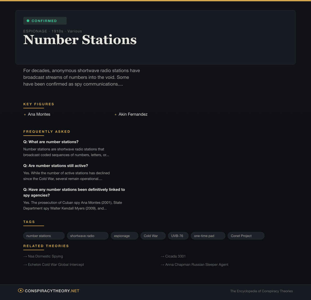 Number stations are, by any reasonable measure, one of the genuinely creepiest phenomena in the history of telecommunications. They exist at the intersection of Cold War paranoia, signals intelligence, unbreakable mathematics, and the kind of deep radio weirdness that makes the shortwave spectrum feel like a haunted house. They’ve inspired cult music projects, obsessive hobbyist communities, and at least one landmark indie rock album. And while several have been definitively linked to intelligence agencies through criminal prosecutions — making this a confirmed conspiracy rather than a theory — dozens more continue to broadcast without any official acknowledgment from any government on Earth.