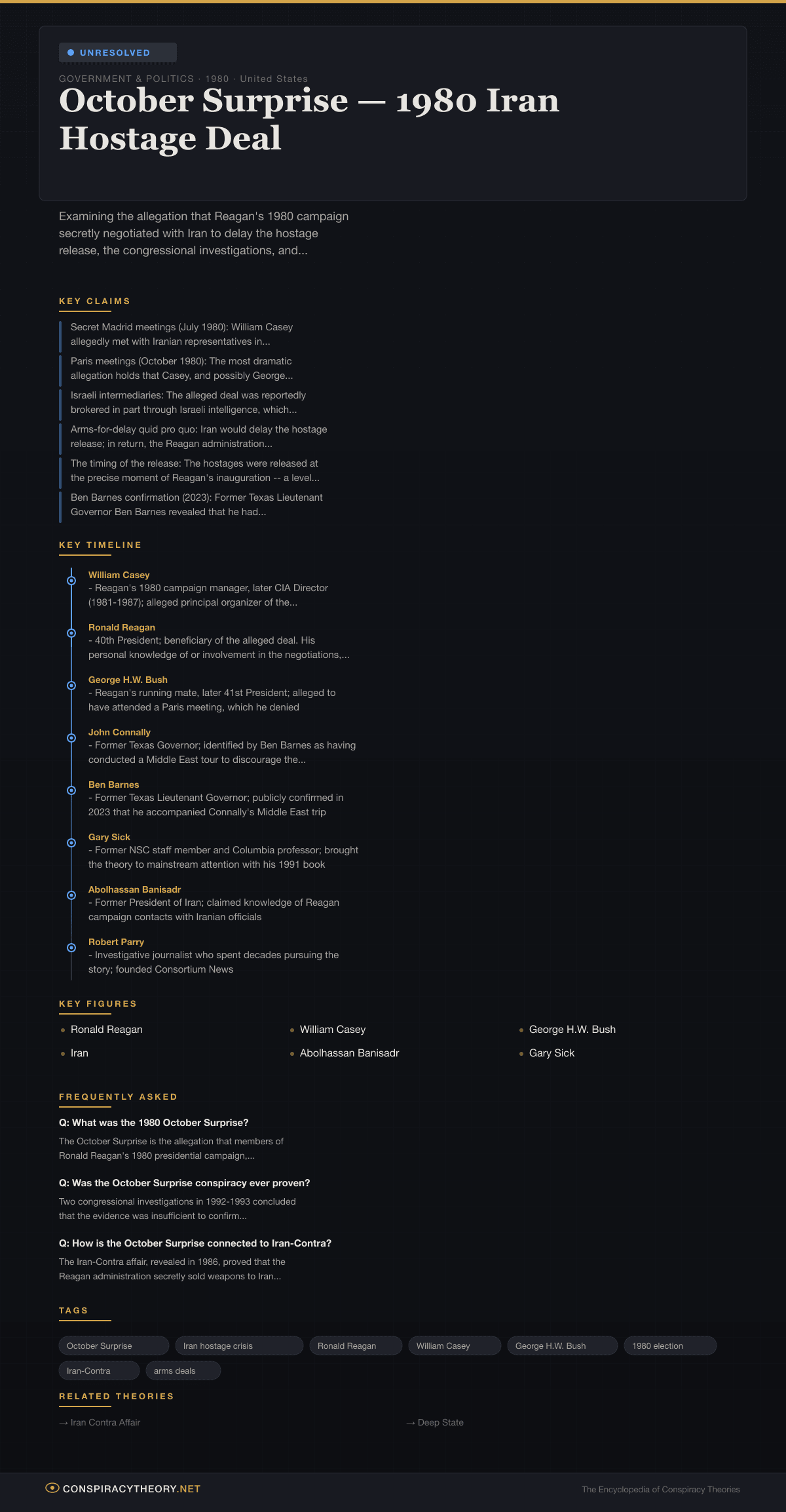 The theory’s “mixed” status (classified here as unresolved due to the absence of definitive documentary proof) reflects a genuine historical ambiguity. The circumstantial evidence is substantial. The timing of the hostage release is suggestive. The Iran-Contra connection provides a documented pattern of the Reagan administration secretly dealing with Iran through exactly the channels alleged. But no document, recording, or irrefutable firsthand account has emerged to prove conclusively that Casey or Bush struck a deal with Iran in 1980.