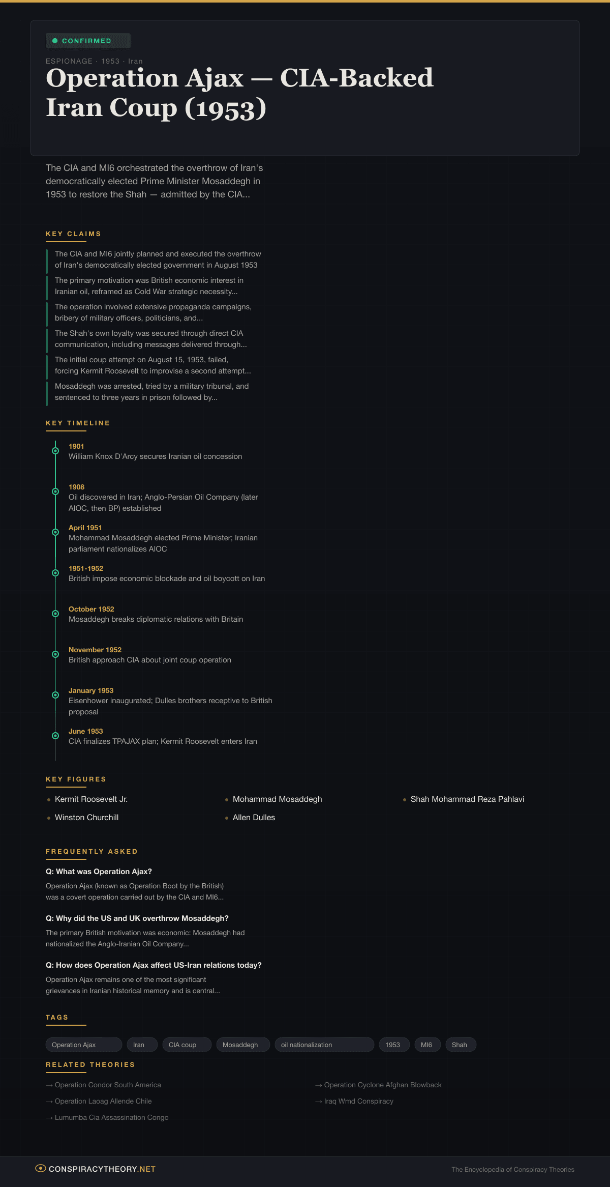 Operation Ajax is classified as confirmed — it is a documented historical fact, acknowledged by the governments that carried it out. Its significance extends far beyond the events of August 1953. The coup destroyed Iran’s experiment with democratic governance, installed an authoritarian regime whose repression would fuel the 1979 Islamic Revolution, and set in motion a chain of events that continues to shape Middle Eastern geopolitics, US-Iran relations, and global perceptions of American foreign policy.