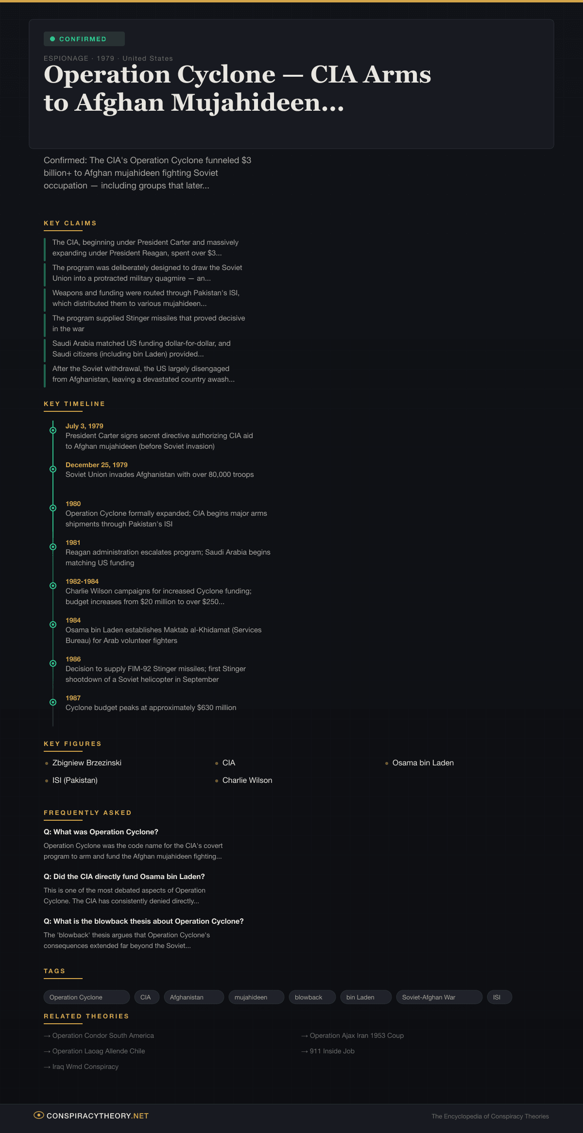 The operation is classified as confirmed. Its existence, scope, and basic parameters have been acknowledged by multiple US officials, documented in declassified materials, and described in detail by participants. The relationship between Operation Cyclone and subsequent events — particularly the rise of Al-Qaeda — involves more complex questions of causation and responsibility that remain debated.