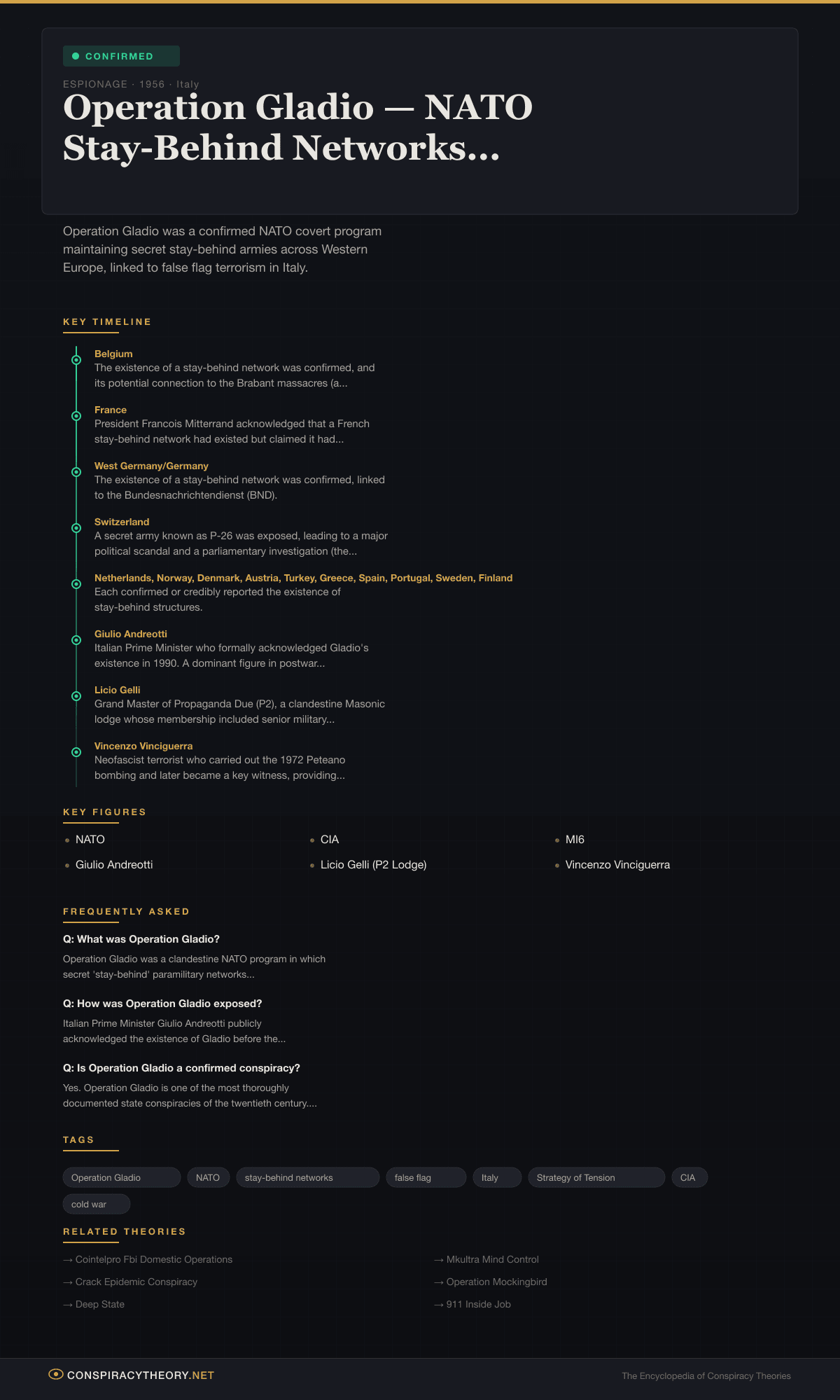 Operation Gladio was a clandestine NATO-backed program that established secret paramilitary networks — known as “stay-behind” armies — across Western Europe during the Cold War. Initially conceived as a resistance infrastructure to be activated in the event of a Soviet invasion, these networks operated entirely outside democratic oversight for decades. In Italy, where the program took its name from the Roman short sword (the gladius), the stay-behind network became entangled with far-right extremist groups, organized crime, and elements within the Italian intelligence services.