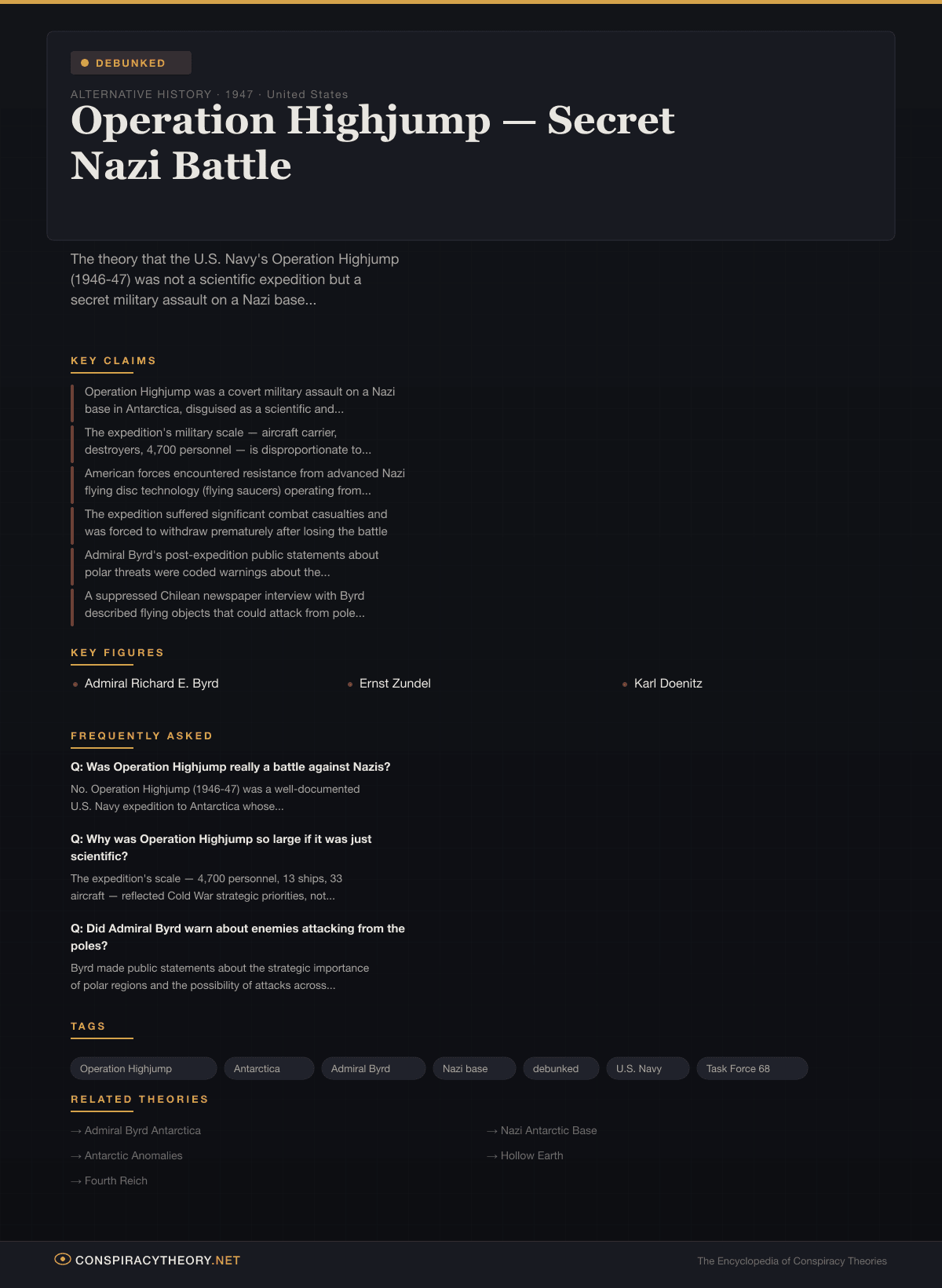 The Operation Highjump battle narrative has become one of the most visually compelling stories in conspiracy culture, combining military adventure, secret Nazi technology, and Antarctic mystery into a narrative that functions as a kind of alternative history pulp fiction. It has been retold in countless YouTube videos, blog posts, and online documentaries, many of which present the claims with dramatic recreations and ominous narration that make them emotionally persuasive regardless of their factual basis.