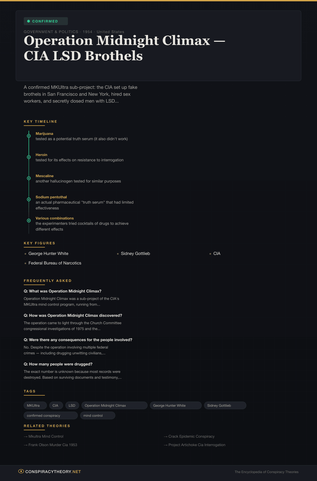 Operation Midnight Climax was a sub-project of MKUltra — the CIA’s sprawling, secret program to develop mind control techniques, truth serums, and methods of psychological manipulation. MKUltra ran from 1953 to 1973, encompassed 149 sub-projects, and involved experiments on unwitting subjects at universities, hospitals, prisons, and — in the case of Midnight Climax — brothels.