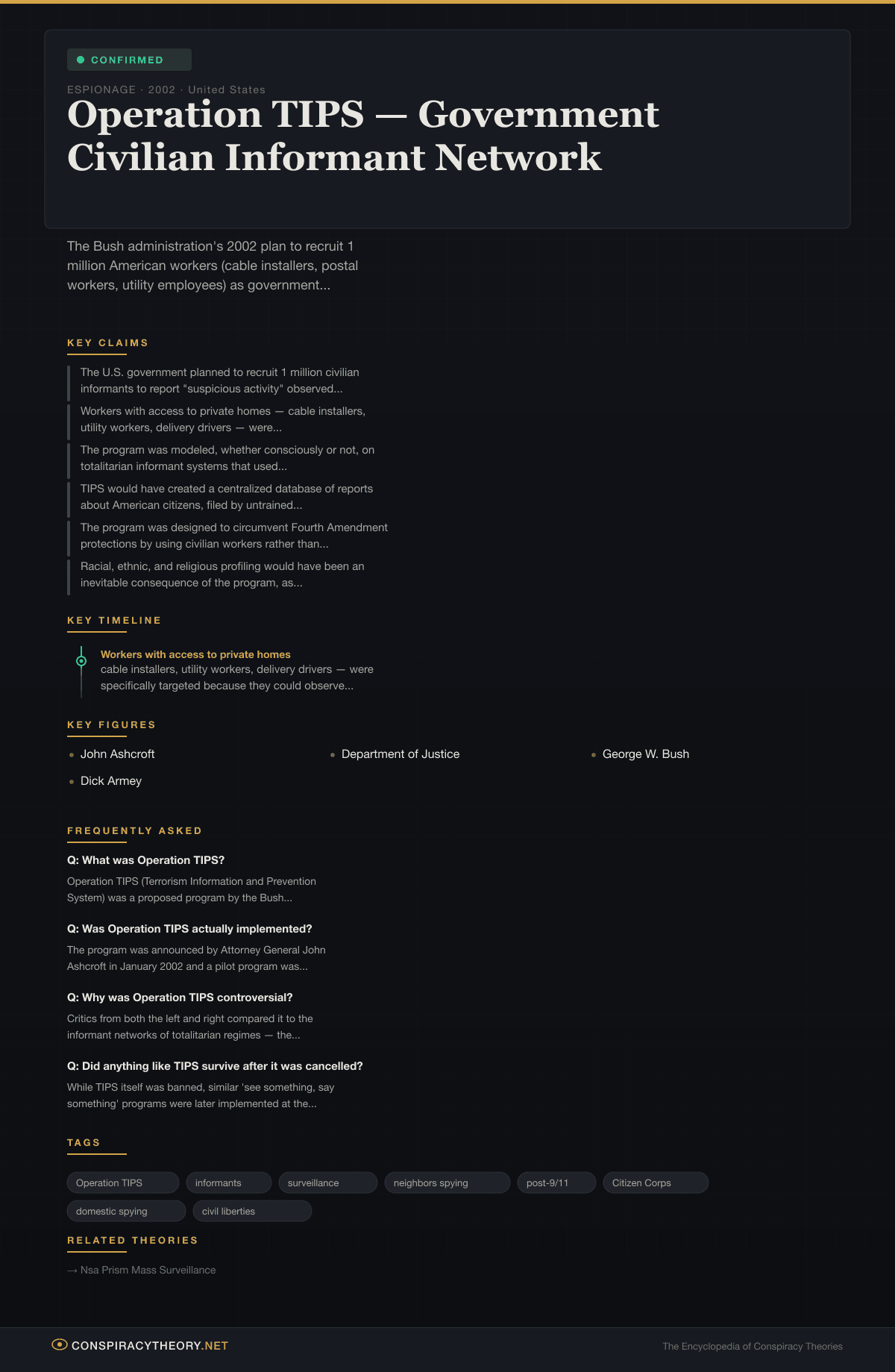 Operation TIPS is confirmed history. Its significance lies not in secrecy but in transparency: the U.S. government openly proposed turning millions of workers into a domestic spy network, and the only thing that stopped it was the democratic process working — barely — as intended.