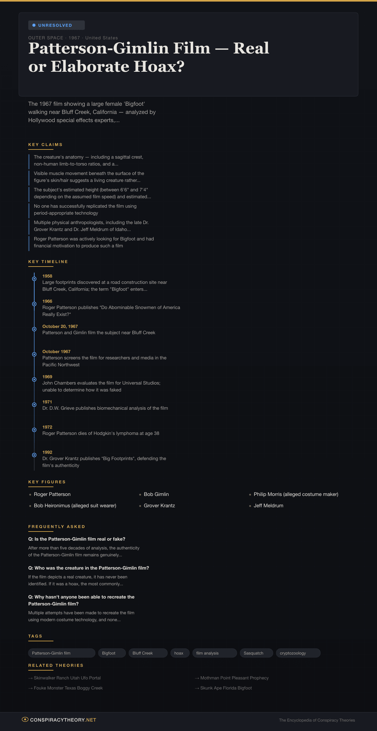 The film is by far the most famous and most analyzed piece of evidence in the Bigfoot phenomenon. It has been subjected to scrutiny by Hollywood special effects artists, primatologists, forensic anthropologists, biomechanics researchers, and film analysts for more than five decades. Despite this exhaustive examination, no consensus has been reached: no one has definitively proven the film to be a hoax, nor has anyone produced a living specimen or physical remains to confirm the creature’s existence.