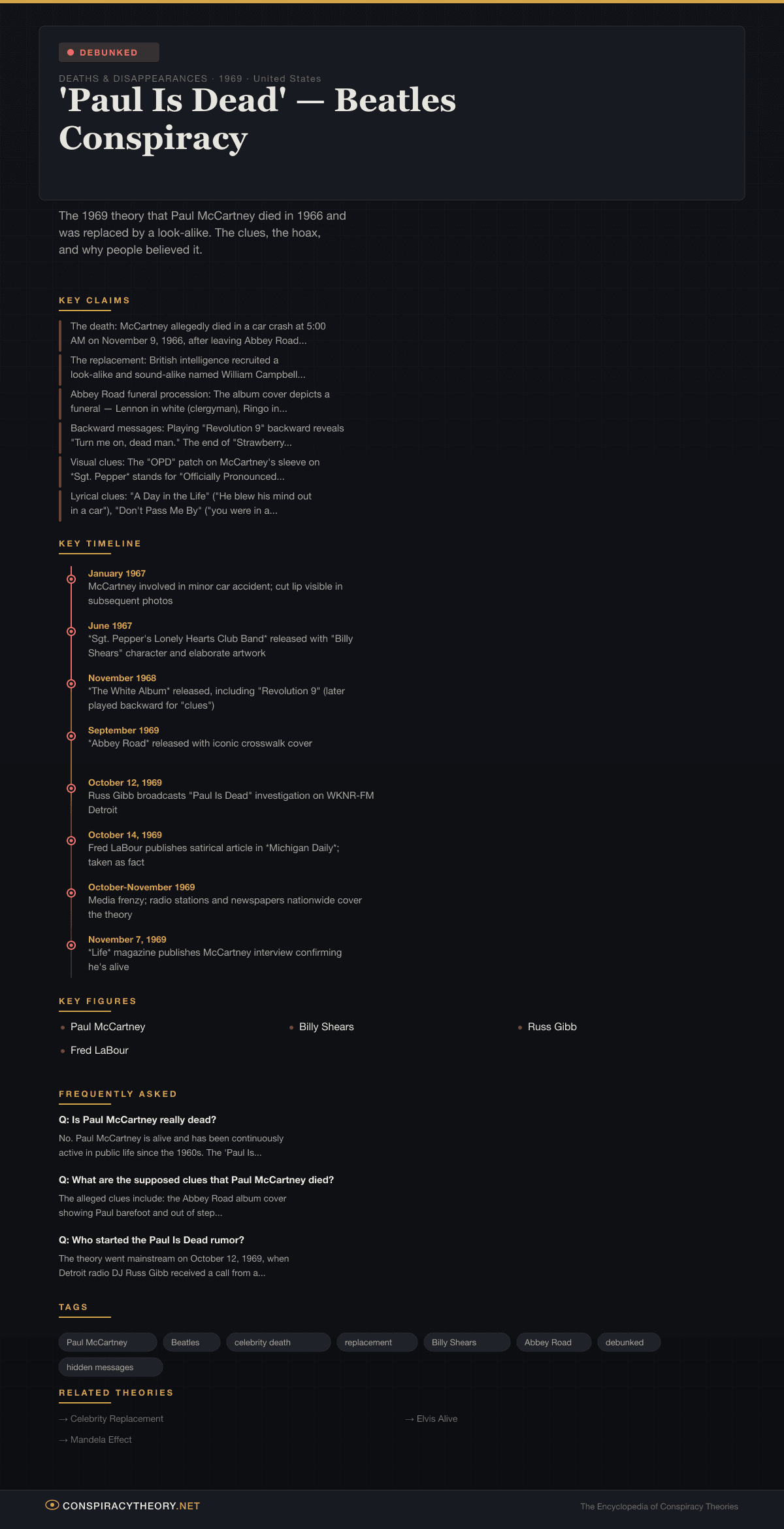 “Paul Is Dead” is one of the most famous and enduring pop culture conspiracy theories. It claims that Paul McCartney, bass player and vocalist of the Beatles, died in a car accident on November 9, 1966, and was secretly replaced by a look-alike — variously identified as William Campbell or “Billy Shears” — while the remaining Beatles embedded clues about Paul’s death throughout their subsequent albums as a form of coded confession.