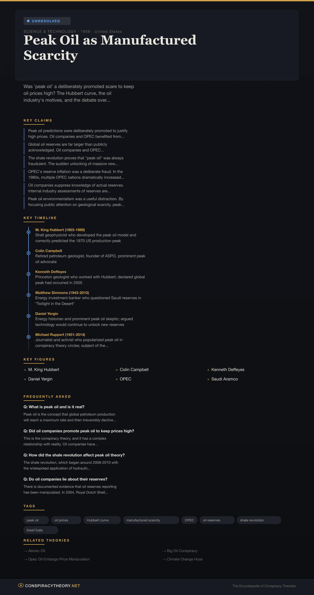 The theory is classified as unresolved because while the peak oil movement’s specific predictions have repeatedly failed, the underlying geological reality — that oil is a finite resource — is uncontested, and there are documented instances of oil reserves manipulation that give the scarcity-and-manipulation narrative some factual grounding.