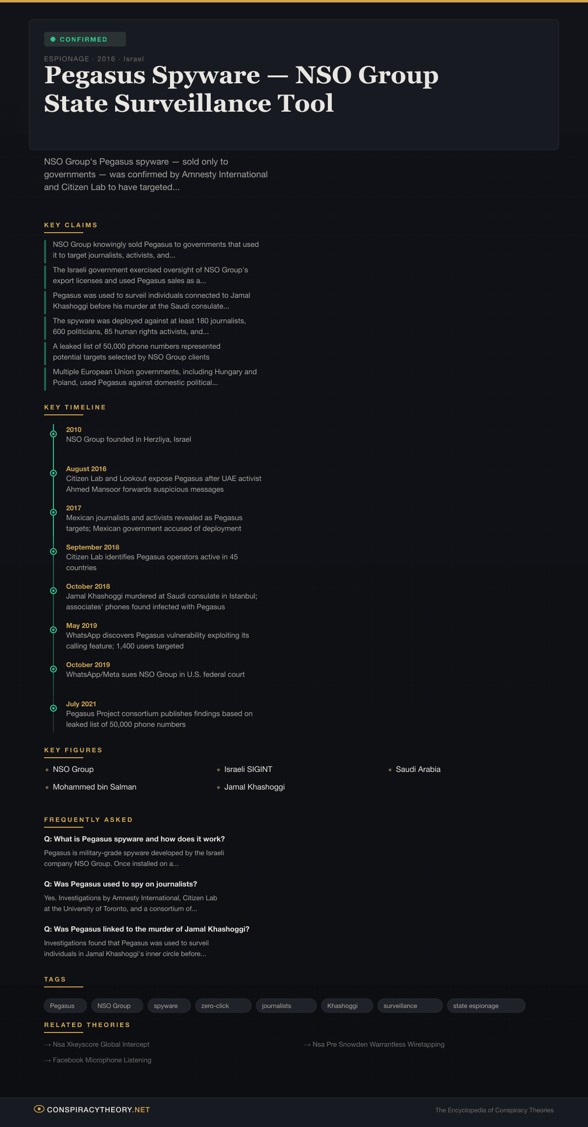 This conspiracy is classified as confirmed. The deployment of Pegasus against journalists and activists has been verified through: