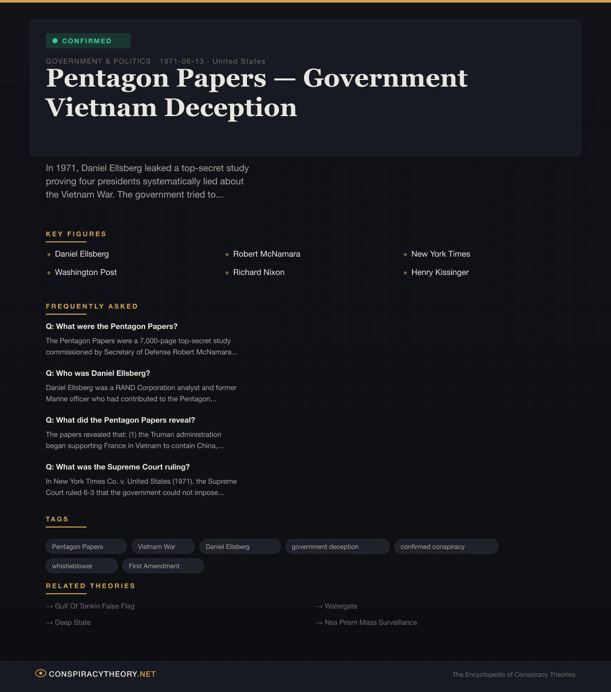 The Pentagon Papers didn’t end the Vietnam War. But they ended any pretense that the government’s account of the war could be trusted. They triggered a constitutional crisis, a landmark Supreme Court case, and a chain of events that led directly to Watergate and the resignation of a president. And they established, as confirmed fact rather than conspiracy theory, that the American government was capable of sustained, systematic deception on a massive scale.