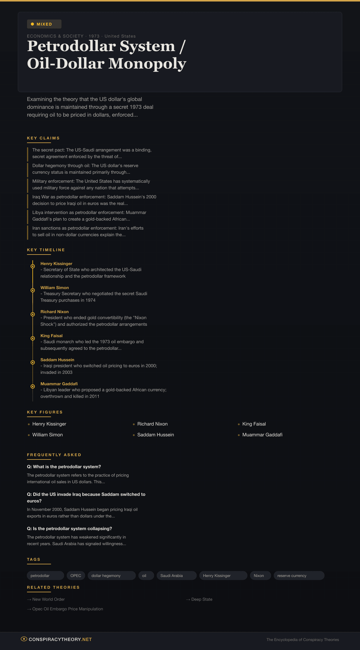 The petrodollar conspiracy theory argues that the US dollar’s continued global dominance is maintained not by the strength of the American economy or the depth of its financial markets, but by a secret 1973-1974 agreement with Saudi Arabia requiring that oil — the most traded commodity on Earth — be priced exclusively in US dollars. This arrangement, the theory holds, is enforced by American military power, and any nation that attempts to break the petrodollar monopoly by pricing oil in an alternative currency risks invasion, regime change, or economic destruction.