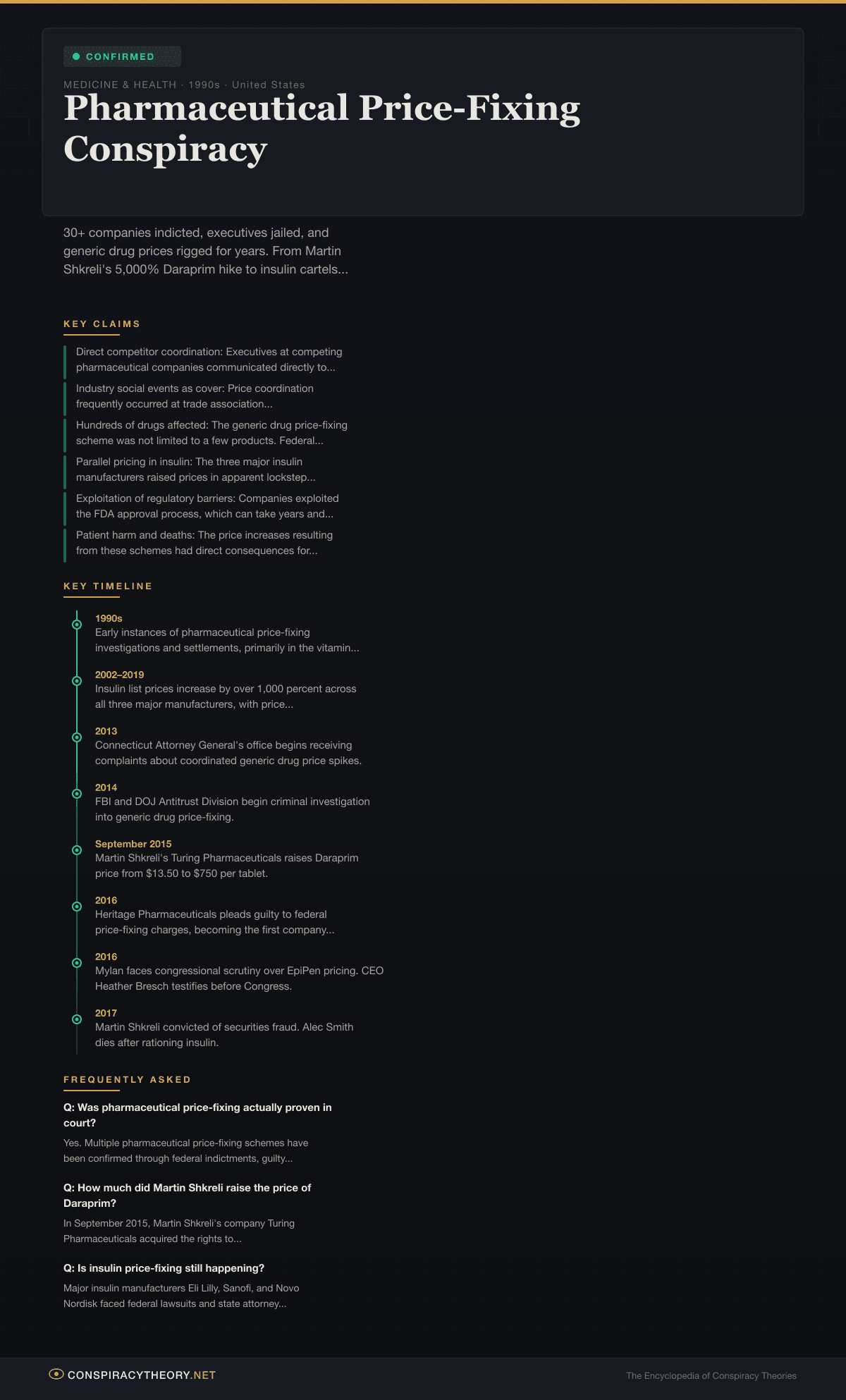 Concerns about pharmaceutical pricing practices date back decades, but the modern era of confirmed price-fixing conspiracies begins in the 1990s and accelerates dramatically in the 2010s.