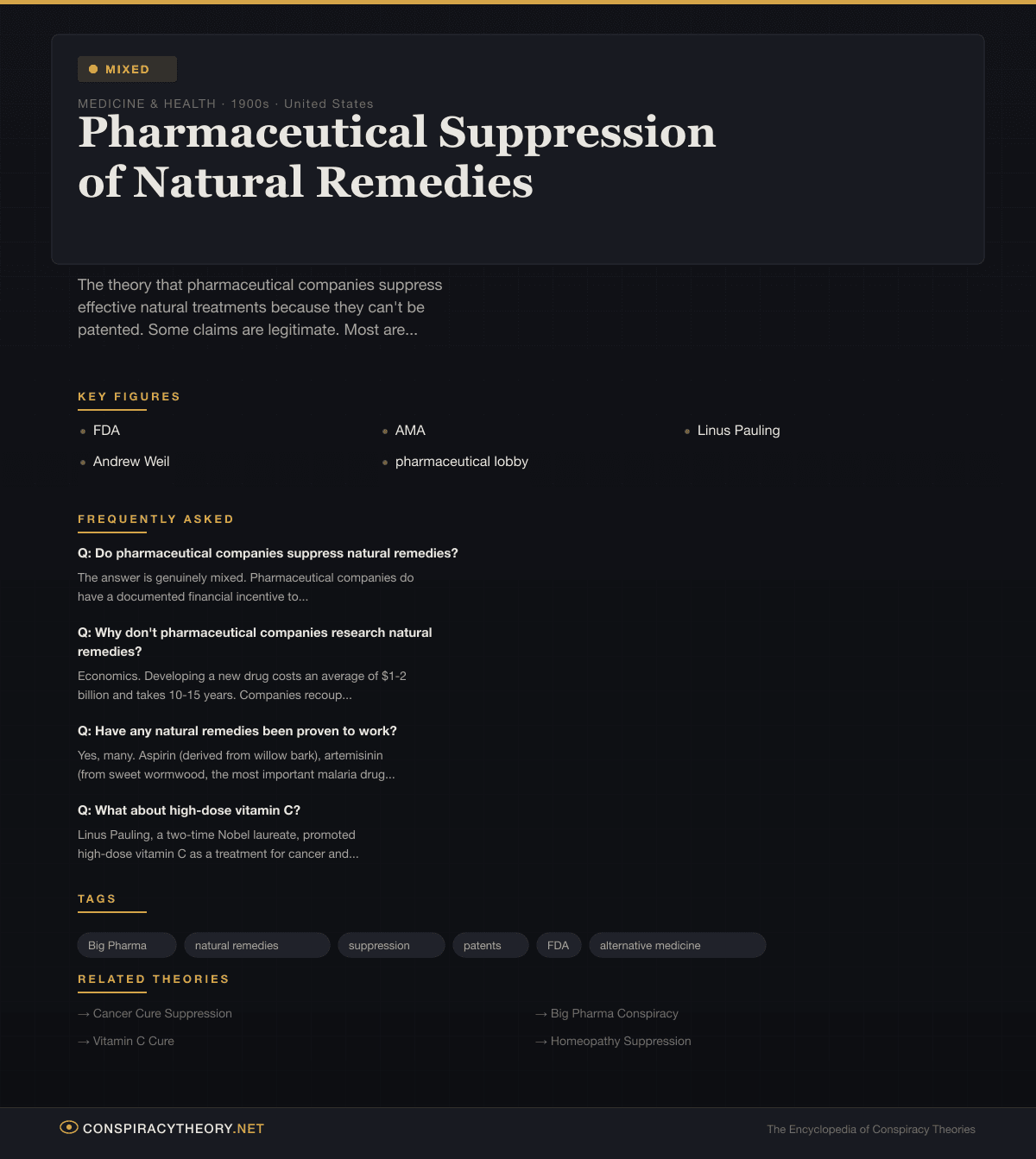 The pharmaceutical suppression theory occupies a genuinely complicated middle ground. The structural incentive problems are real. The funding gap for natural compound research is real. The pharmaceutical industry’s history of misconduct is real. But the leap from “the system underfunds natural remedy research” to “effective cures are being suppressed” is not supported by evidence.