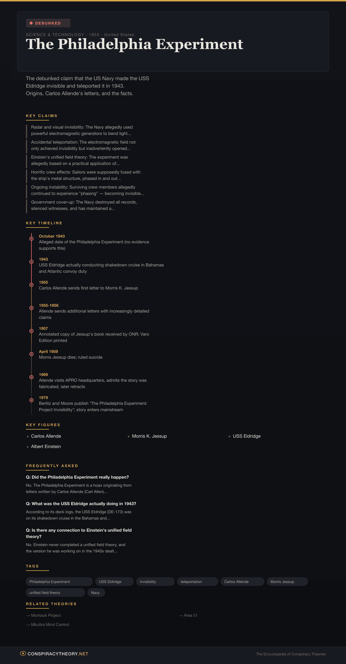 The experiment is classified as debunked. The USS Eldridge’s deck logs place it nowhere near Philadelphia during the alleged timeframe. The Navy has repeatedly denied the experiment occurred. No crew member has ever corroborated the story. And Allende himself admitted to fabrication on multiple occasions before retracting his retractions. The legend persists because it combines appealing elements — secret military technology, Einstein’s genius, and horrific consequences — into an unfalsifiable narrative.