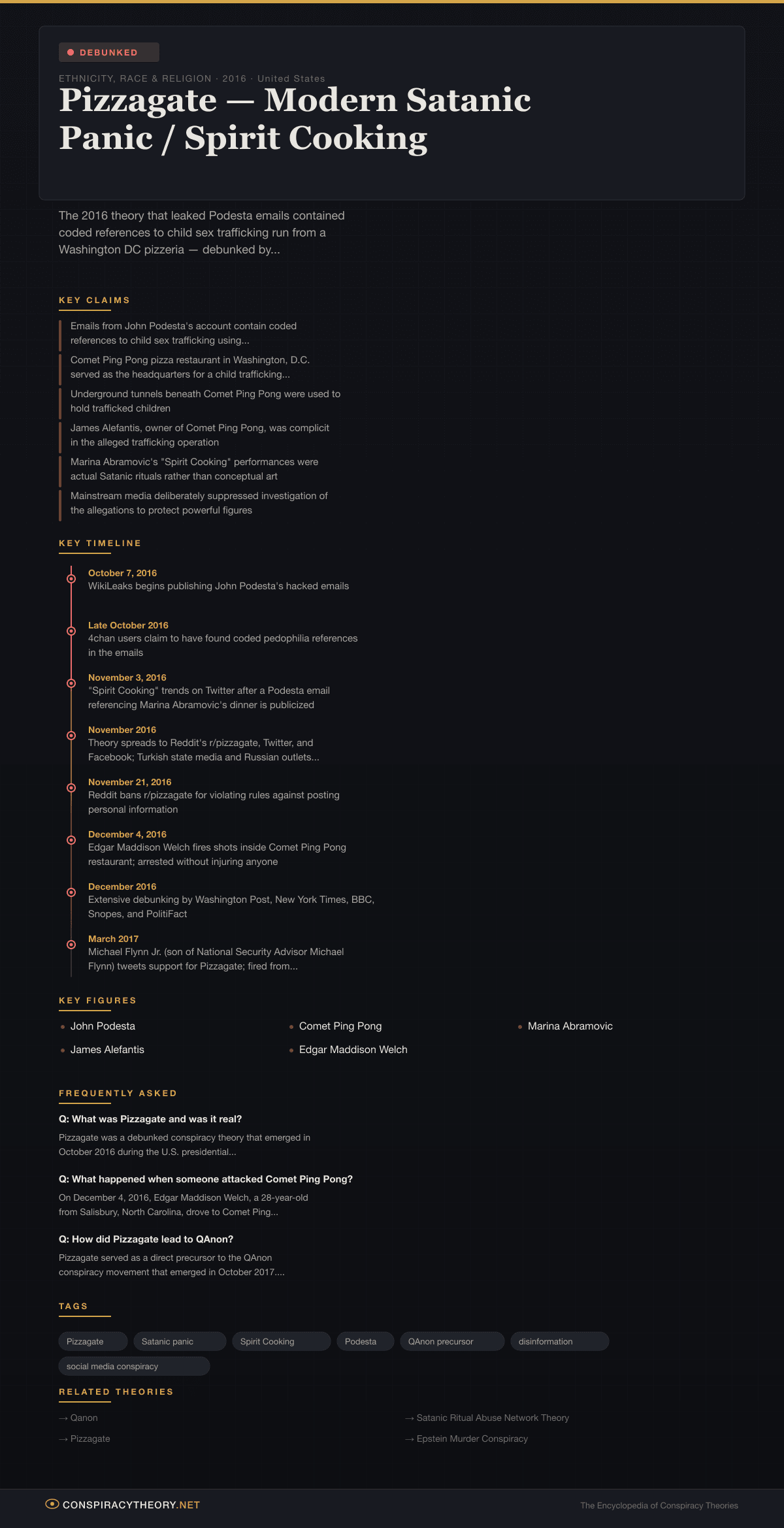 Pizzagate is a debunked conspiracy theory that emerged during the final weeks of the 2016 United States presidential election. The theory alleged that emails from the personal account of John Podesta, chairman of Hillary Clinton’s presidential campaign, contained coded messages revealing a child sex trafficking ring operating from Comet Ping Pong, a pizzeria in the Northwest Washington, D.C. neighborhood of Chevy Chase. The theory incorporated elements of earlier Satanic panic narratives, including claims about “Spirit Cooking” rituals involving performance artist Marina Abramovic.