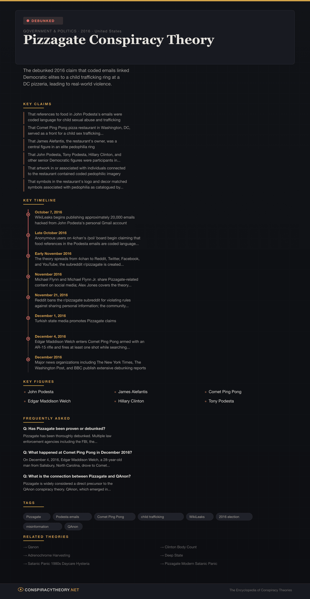 Despite being thoroughly debunked by law enforcement, news organizations, and independent fact-checkers, Pizzagate had severe real-world consequences. On December 4, 2016, a man armed with an assault rifle entered Comet Ping Pong to “self-investigate” the claims, firing at least one shot before surrendering to police. The theory is widely considered a landmark case study in the dangers of online misinformation and is recognized as a direct precursor to the larger QAnon conspiracy movement.
