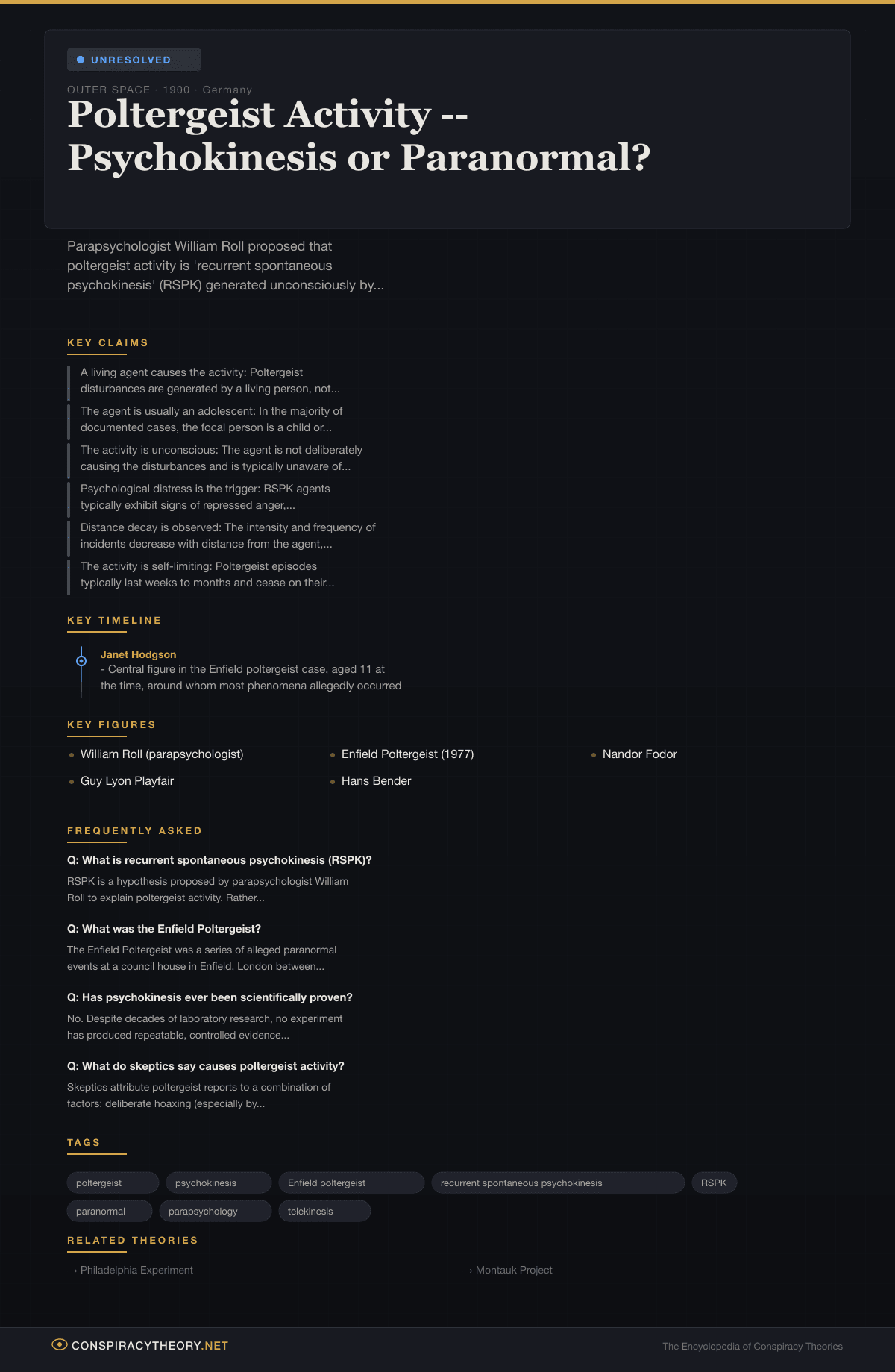 | 1930s-40s | Nandor Fodor proposes psychological explanations for poltergeist phenomena |