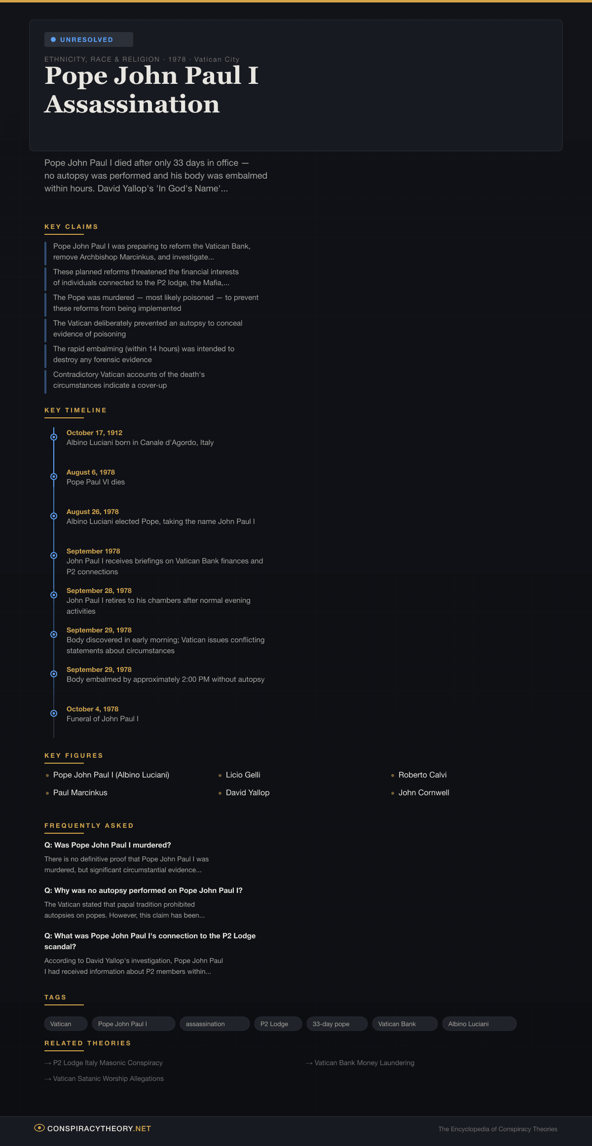 On September 28, 1978, Pope John Paul I — born Albino Luciani — was found dead in his bed in the Apostolic Palace after only 33 days as pontiff, one of the shortest reigns in papal history. The official cause of death was given as acute myocardial infarction. No autopsy was performed, and the body was embalmed within hours of discovery. The Vatican’s initial accounts of the circumstances surrounding the death contained contradictions that were quickly seized upon by both journalists and clergy.