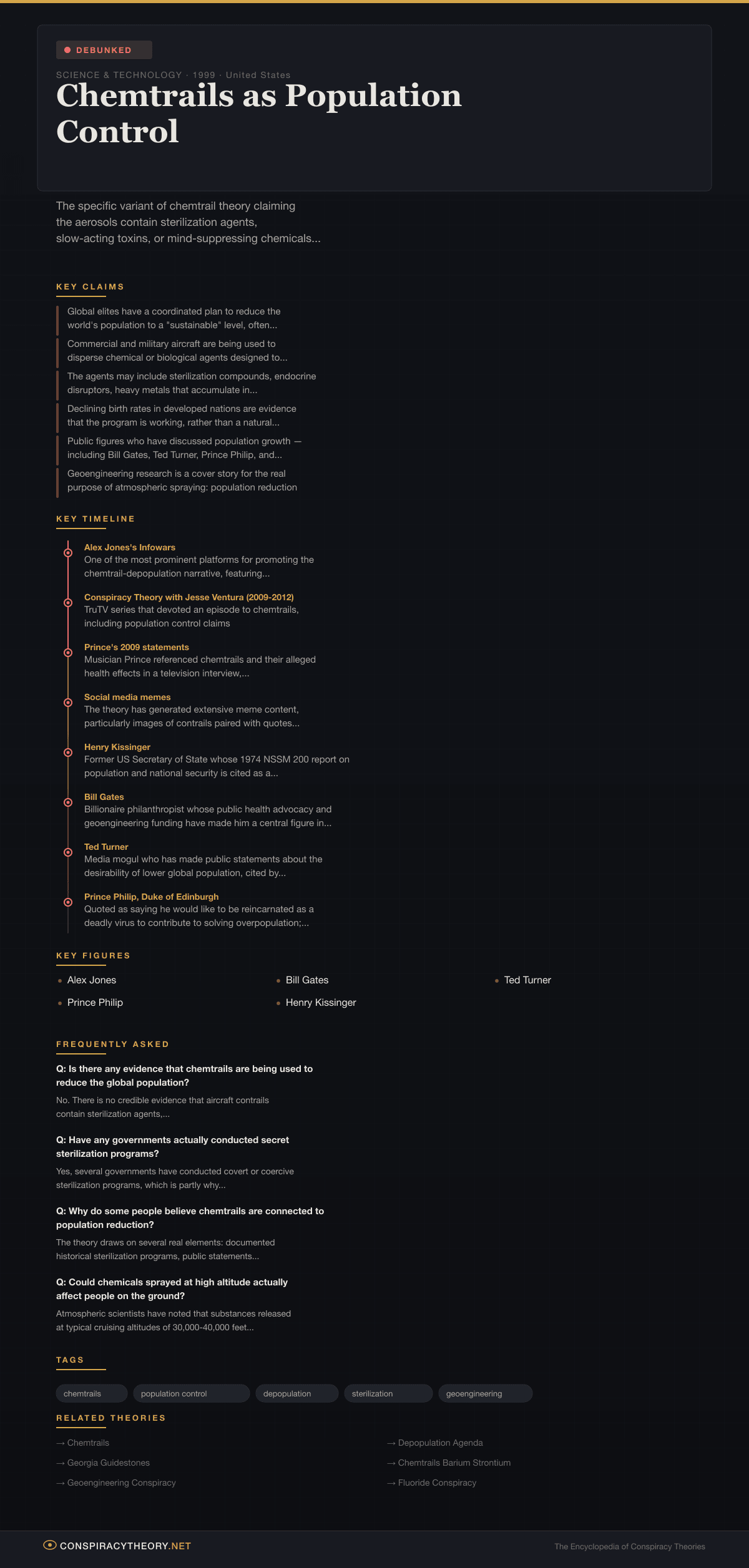 - Late 1990s — Population control claims first attached to chemtrail theory in internet forums