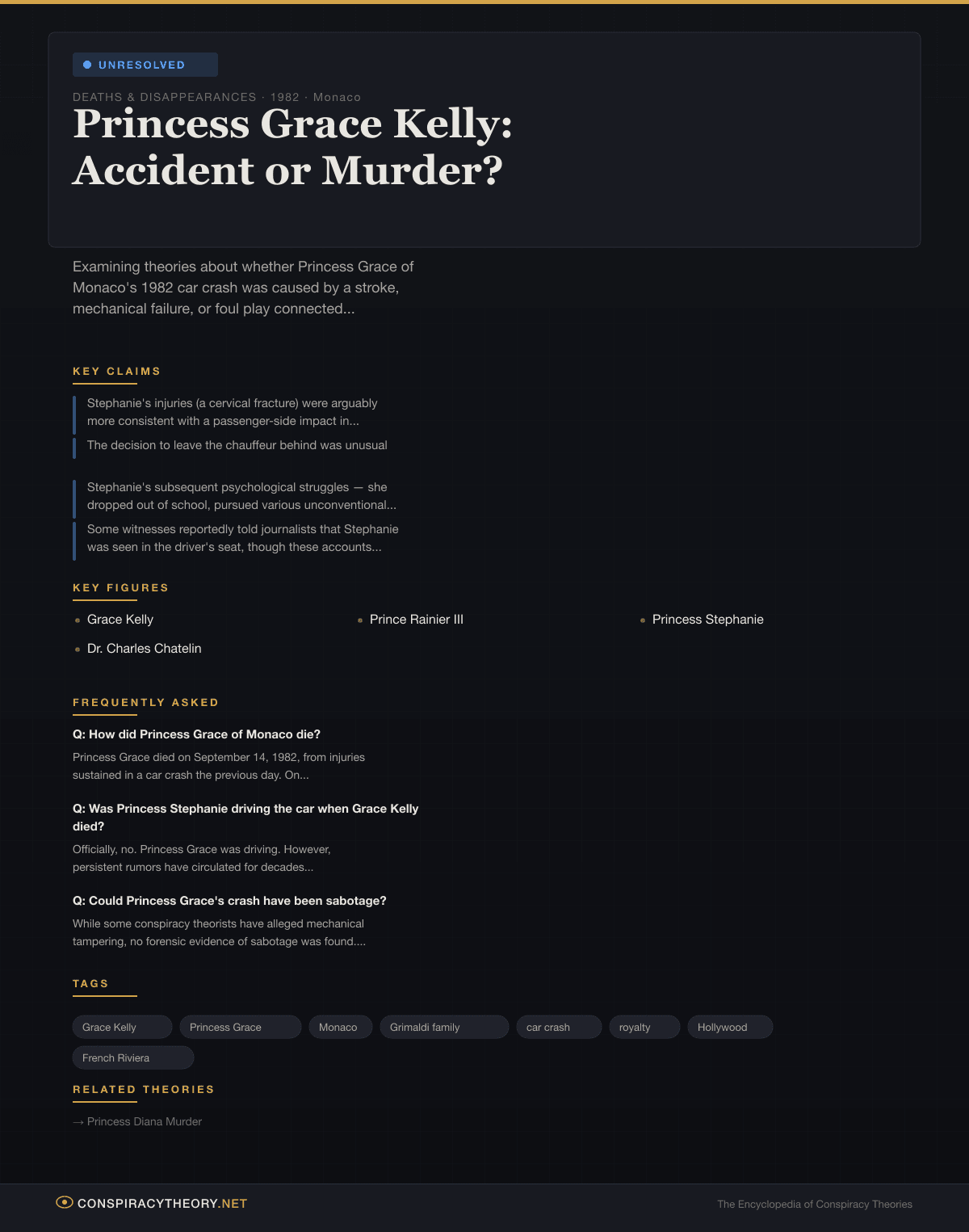 A related but less sinister theory holds that Grace was planning to leave Monaco — either to return to acting, to separate from Rainier, or simply to live independently — and that her death, while accidental, occurred in a context of family tension that the official account papered over. This is less a conspiracy theory than a biographical reinterpretation: the crash was an accident, but it happened to a woman who was deeply unhappy and whose unhappiness was inconvenient for the people around her.