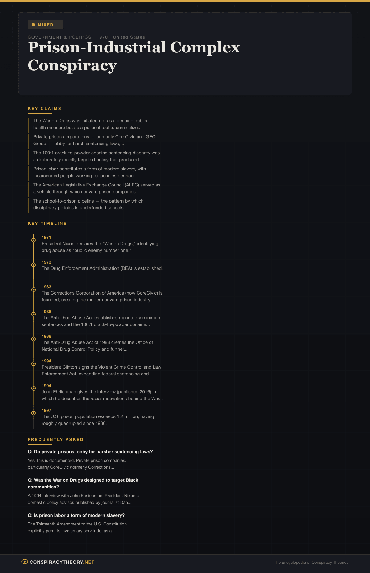 This theory occupies a “mixed” status because many of its factual claims are well-documented while its overarching conspiratorial narrative — that all of these elements represent a coordinated, deliberate plan — remains debated. The War on Drugs did disproportionately target communities of color, and there is direct testimony from Nixon administration officials confirming racial motivations. Private prison companies have lobbied for harsh sentencing. Prison labor does operate at wages far below market rates. However, mass incarceration also resulted from genuine public fear of crime during the crack epidemic, bipartisan “tough on crime” politics supported by many Black community leaders, and a complex web of institutional incentives that may not require conspiracy to explain.