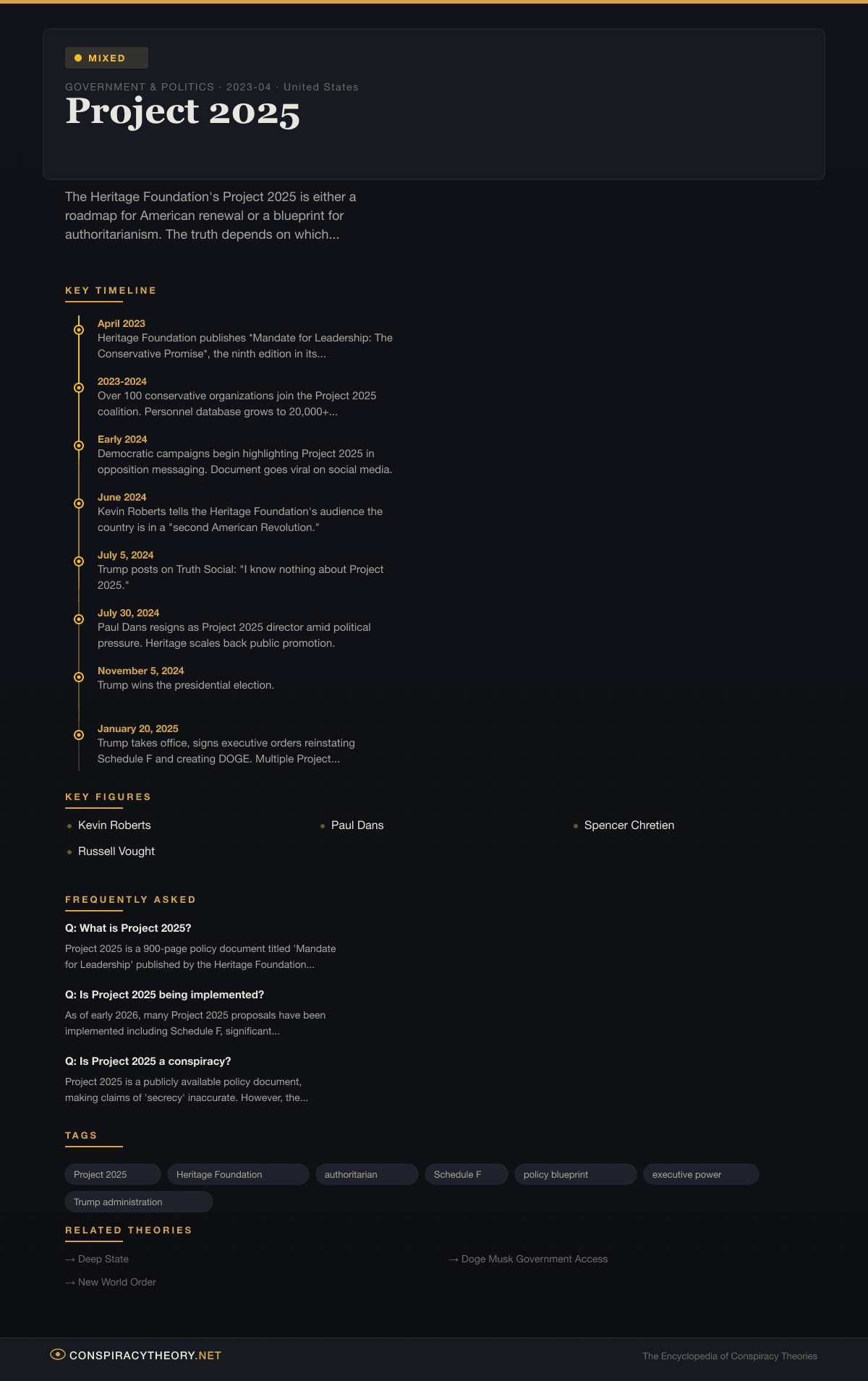 Project 2025 fits into a pattern seen repeatedly in the conspiracy theory landscape: a real document or event gets absorbed into competing conspiratorial frameworks that each distort it in characteristic ways. The left sees a coordinated authoritarian plot. The right sees a coordinated smear campaign. The document itself — dense, contradictory, containing both mundane policy proposals and genuinely radical structural changes — gets lost in the noise.