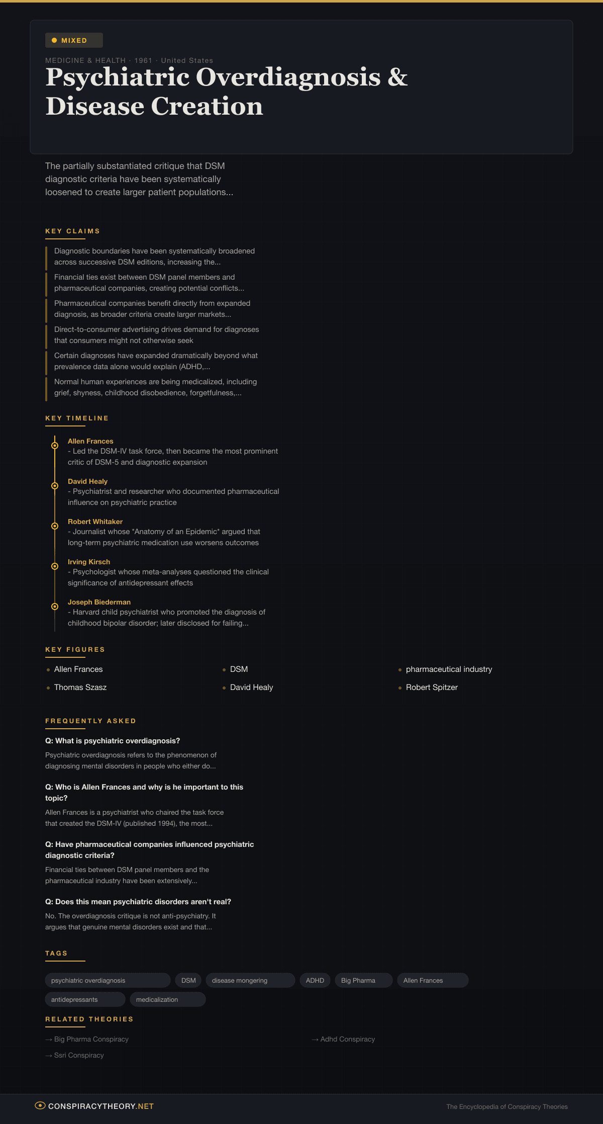 Medical disclaimer: Mental illness is real, and psychiatric treatment helps millions of people. Individuals experiencing psychological distress should consult qualified mental health professionals. The overdiagnosis critique concerns diagnostic boundaries and systemic incentives, not the legitimacy of psychiatric treatment for those who need it.