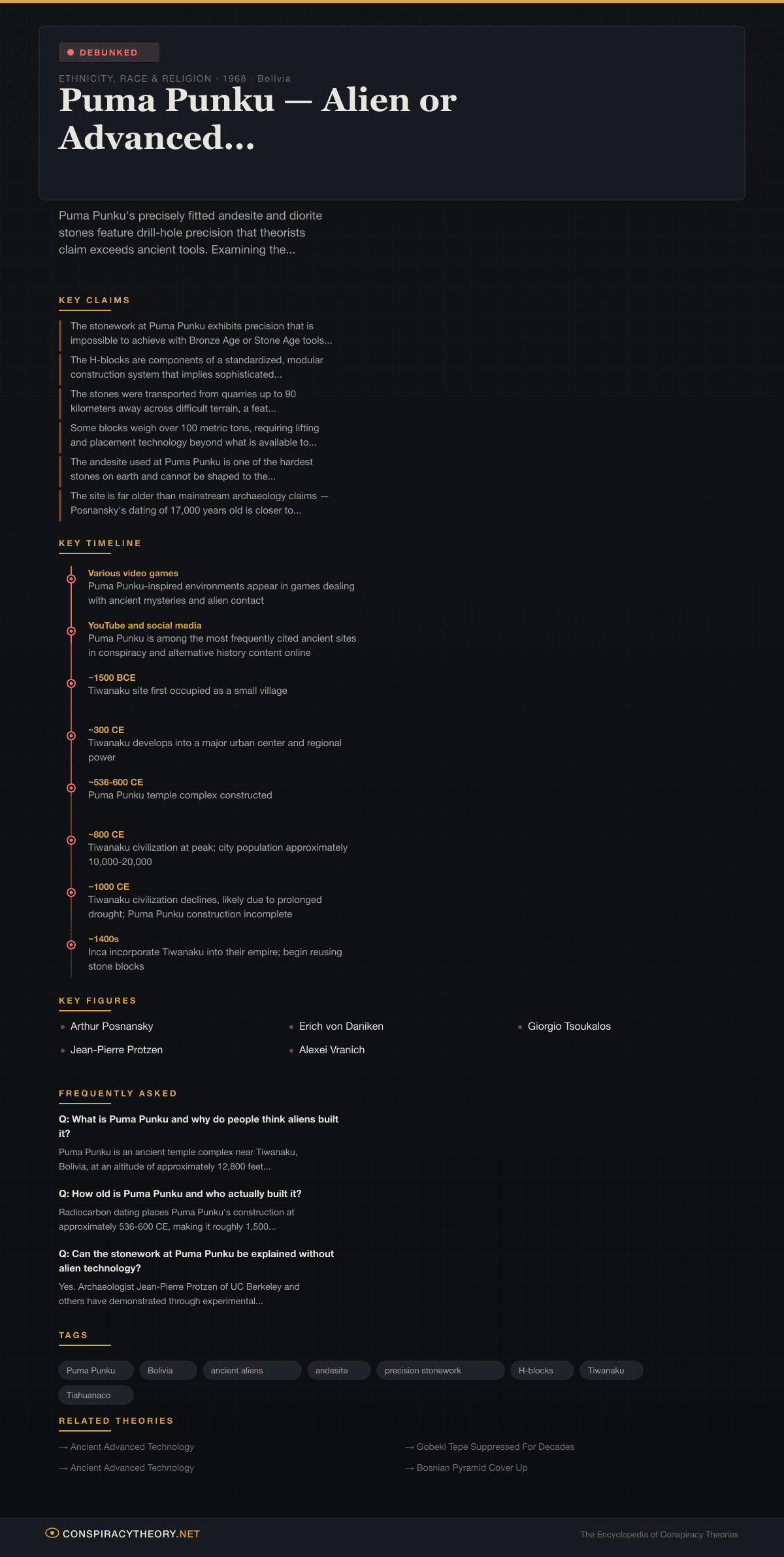 The ancient alien theory as applied to Puma Punku is classified as debunked. Archaeological research, experimental archaeology, radiocarbon dating, and comparative analysis have demonstrated that the Tiwanaku civilization (approximately 300-1000 CE) possessed the tools, techniques, labor organization, and cultural motivation to construct Puma Punku without external assistance. The precision of the stonework, while genuinely impressive, falls within the demonstrated capabilities of pre-industrial stone-working cultures worldwide and can be replicated using tools known to have been available at the site.