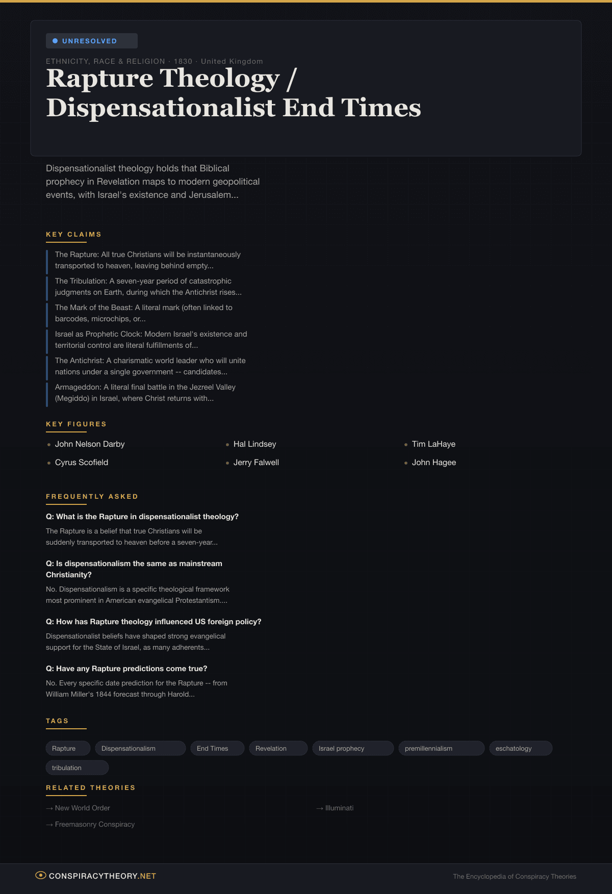 The theory occupies a unique space in the conspiracy landscape. Unlike most entries in this wiki, dispensationalism does not allege a secret human plot. Instead, it frames all of human history as a cosmic conspiracy orchestrated by Satan, with world governments, international organizations, and geopolitical events serving as unwitting (or witting) players in a predetermined divine script. The New World Order, the Illuminati, and even the United Nations have all been cast as agents of the Antichrist by dispensationalist writers — a tendency that has made end-times theology a gateway into secular conspiracy thinking for millions of believers.