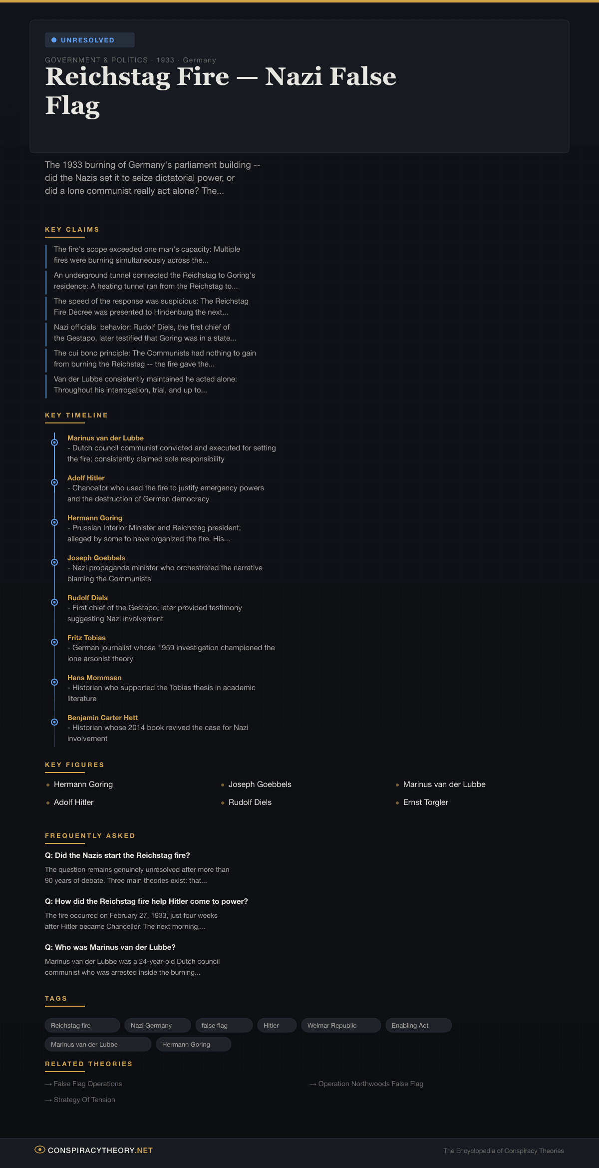 The question that has haunted historians ever since is straightforward: Was the fire exactly what the Nazis claimed it was — a Communist plot that justified emergency measures — or was it exactly what the Nazis needed it to be? Did the Nazis set the fire themselves (or assist van der Lubbe in setting it) precisely to create the pretext for the power grab that followed? The Reichstag fire is the ur-text of the modern false flag debate, the event that gave birth to the suspicion that governments burn down their own buildings to justify the elimination of their enemies.