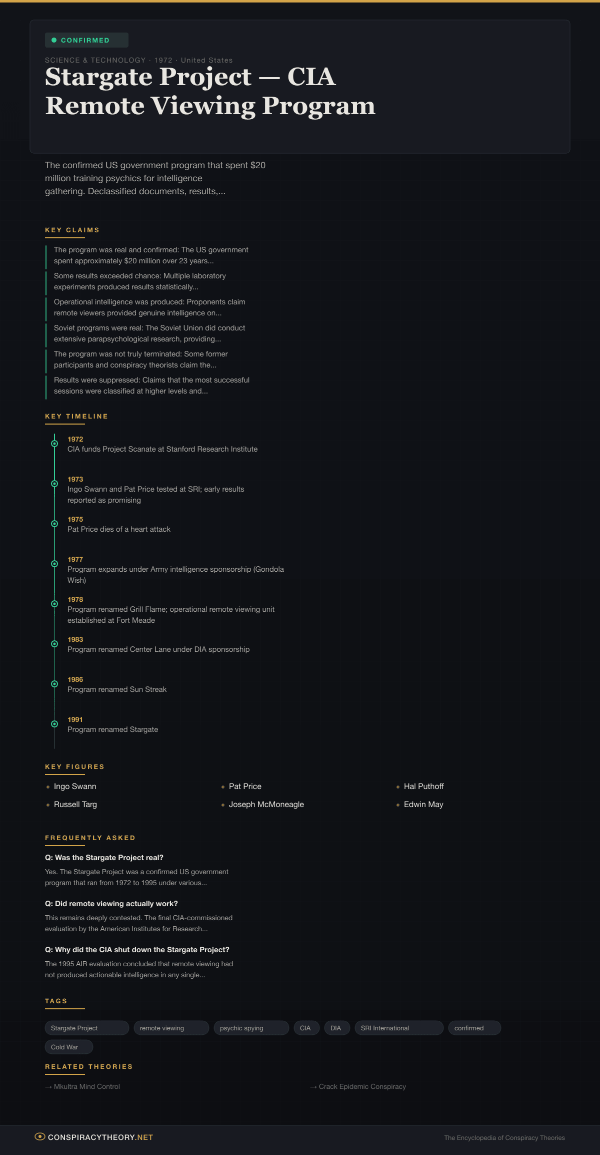 The Stargate Project was a confirmed United States government program that investigated and operationally employed remote viewing — the claimed psychic ability to perceive distant locations, events, or objects without using normal sensory channels. Running from 1972 to 1995 under a series of code names, the program was funded by the CIA, the Defense Intelligence Agency (DIA), and other intelligence community elements at a total cost of approximately $20 million.