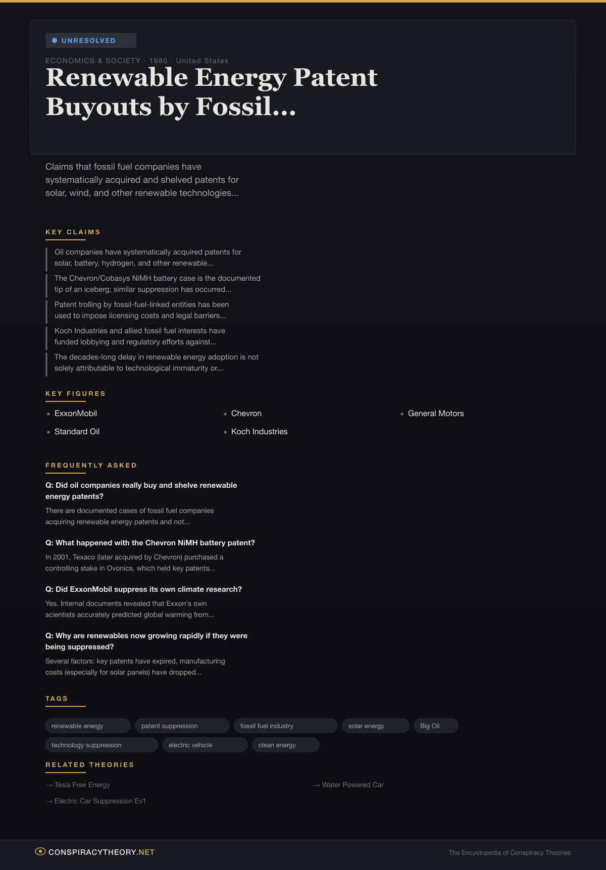 Here is a story that sounds like paranoid fantasy until you start pulling the thread. For decades, conspiracy theorists have alleged that the fossil fuel industry has systematically acquired patents for renewable energy technologies — solar panels, advanced batteries, wind systems, hydrogen fuel cells — only to shelve them, bury them, or license them so restrictively that they could never reach the market. The goal, supposedly, is to protect trillions of dollars in petroleum revenue by ensuring that viable alternatives never gain traction.