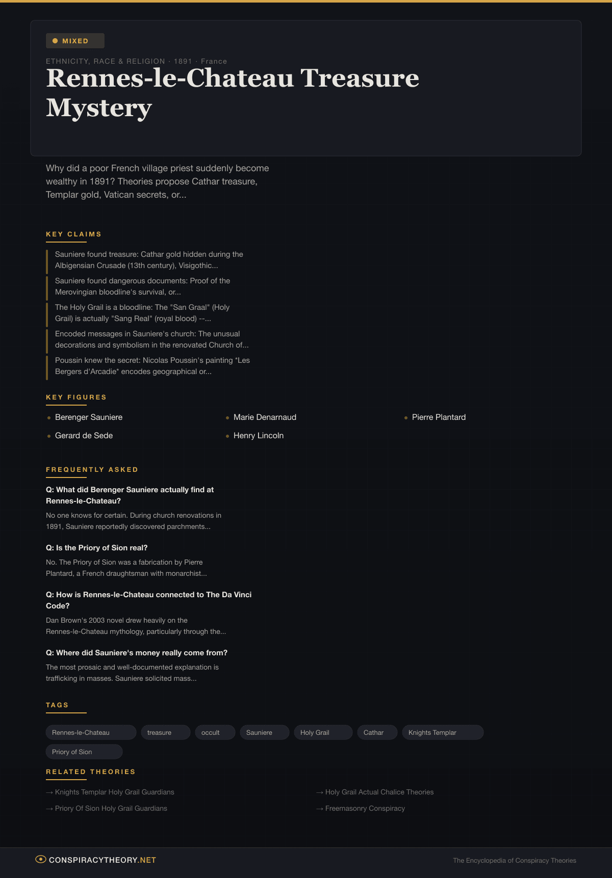 The “mixed” status reflects the fact that the conspiracy theories layered atop Rennes-le-Chateau are demonstrably false, while the underlying historical anomaly — one priest’s unexplained wealth — remains a legitimate, if modest, historical question.