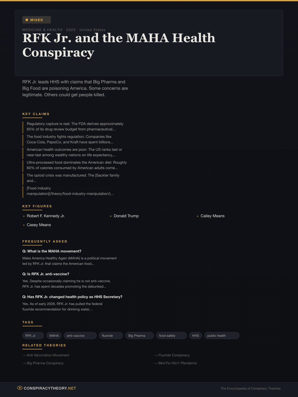 - The entire public health establishment is a criminal conspiracy: While specific instances of corruption and regulatory failure are real, the framing of the entire FDA, CDC, NIH, and pharmaceutical industry as a coordinated conspiracy to sicken Americans for profit is not supported by evidence