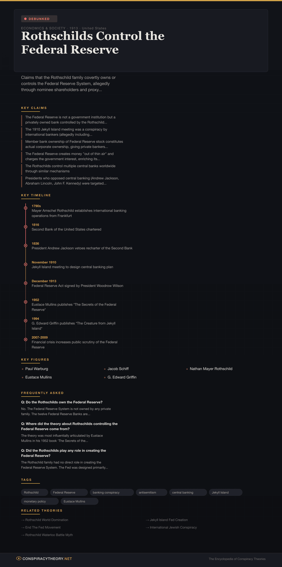 The Rothschild-Federal Reserve theory has been among the most widely circulated financial conspiracy theories for decades. It exists at the intersection of legitimate populist concern about the power of financial institutions and deeply problematic antisemitic narratives about Jewish financial control.