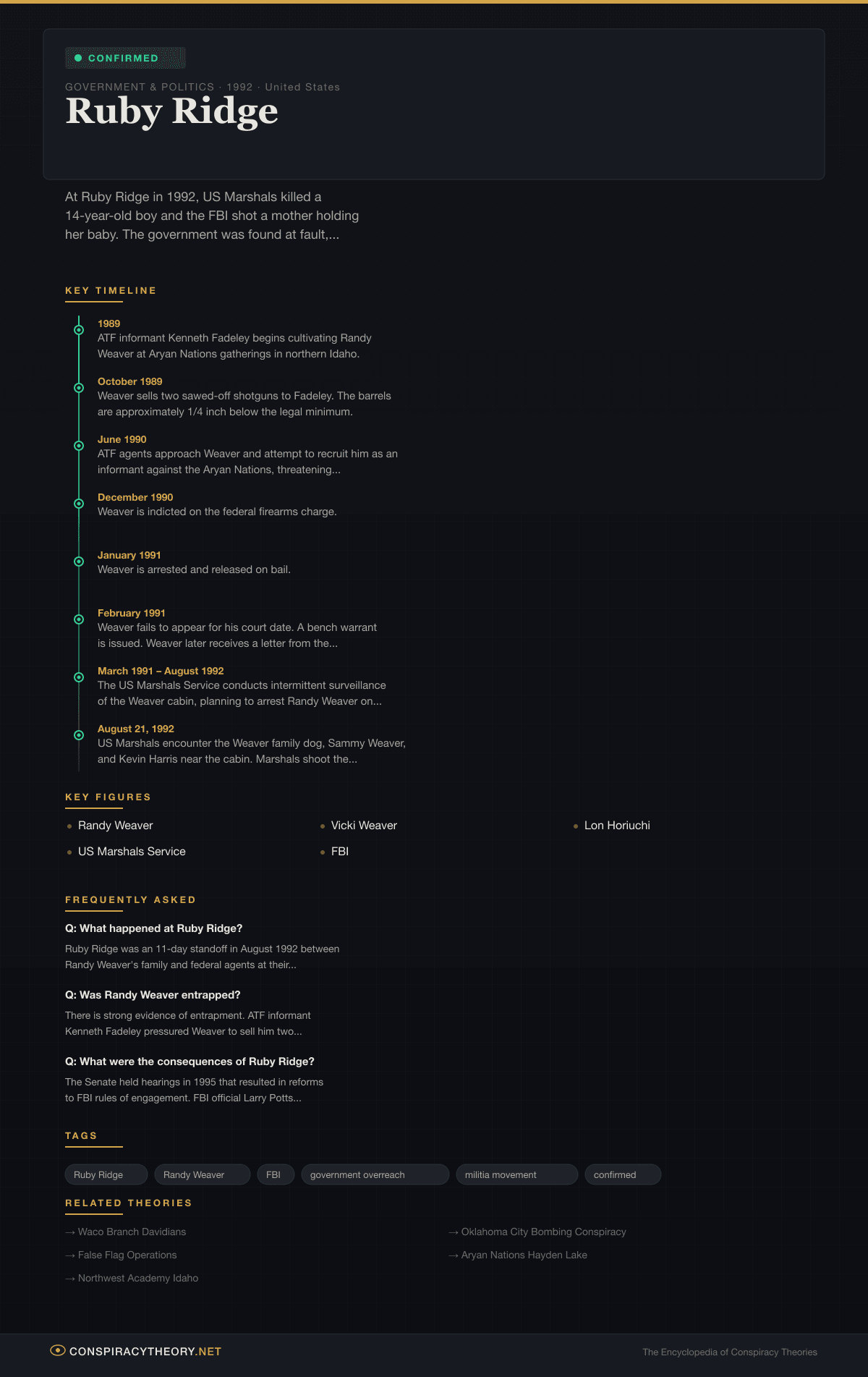 - False Flag Operations — Ruby Ridge is frequently cited in discussions of government-manufactured pretexts for intervention.