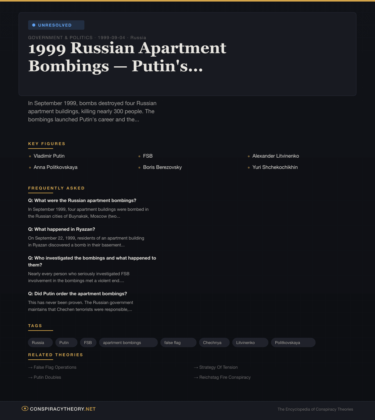 The pattern is not subtle. Ask questions about the apartment bombings, and you die. The trail of bodies is itself the most compelling evidence that the official story cannot withstand scrutiny.