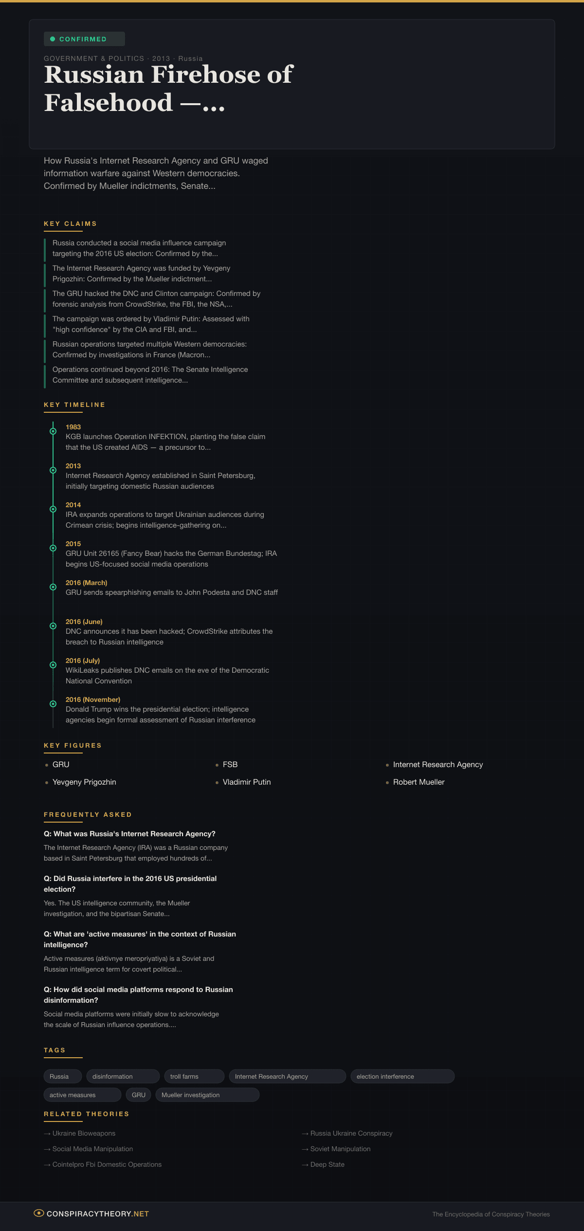 The Russian disinformation campaign is classified as confirmed — one of the rare entries on this site where the conspiracy turned out to be real. The Russian government, through military intelligence (GRU) and proxy organizations funded by allies of Vladimir Putin, conducted systematic operations to influence the 2016 and 2020 US presidential elections, the Brexit referendum, French and German elections, and political discourse across the Western world. The operations combined Cold War-era “active measures” with twenty-first-century digital tools, creating a new model of information warfare that governments and platforms are still struggling to counter.