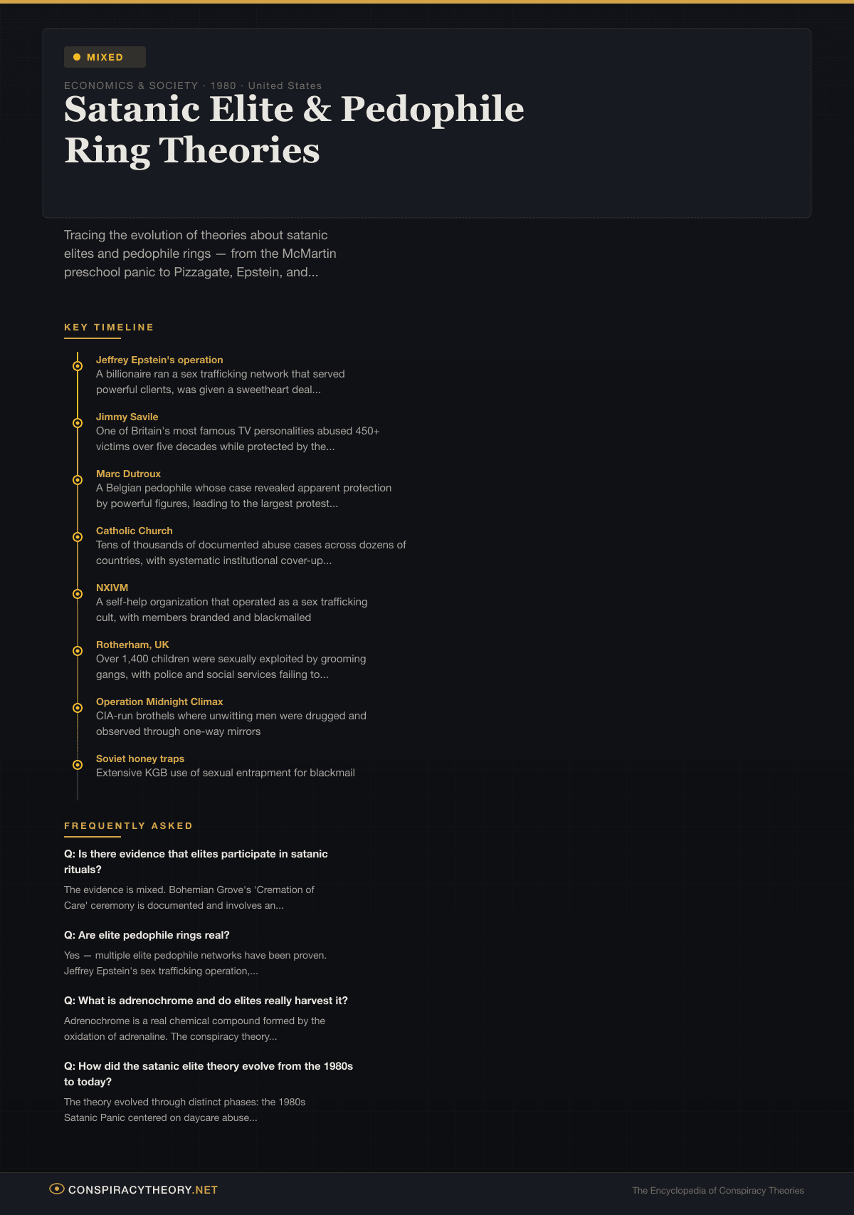 The theory that the world’s most powerful people are members of a satanic cult that engages in child abuse, ritual sacrifice, and occult practices is one of the most persistent and emotionally potent conspiracy theories in modern history. It has evolved through multiple iterations — from the Satanic Panic of the 1980s to Pizzagate in 2016 to QAnon’s comprehensive mythology — each time adapting to contemporary cultural anxieties while retaining core themes about hidden evil operating at the highest levels of power.