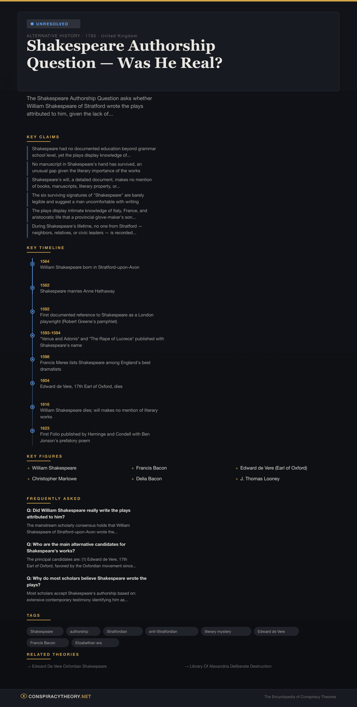 The Shakespeare Authorship Question is one of the oldest and most persistent literary controversies in the English-speaking world. At its core is a seemingly simple inquiry: did William Shakespeare of Stratford-upon-Avon — a man with no documented university education, no record of foreign travel, and no surviving manuscript in his hand — actually write the plays and poems attributed to him? Or were these works, which display extraordinary knowledge of law, languages, classical literature, courtly life, and foreign geography, written by someone else using Shakespeare’s name as a front?