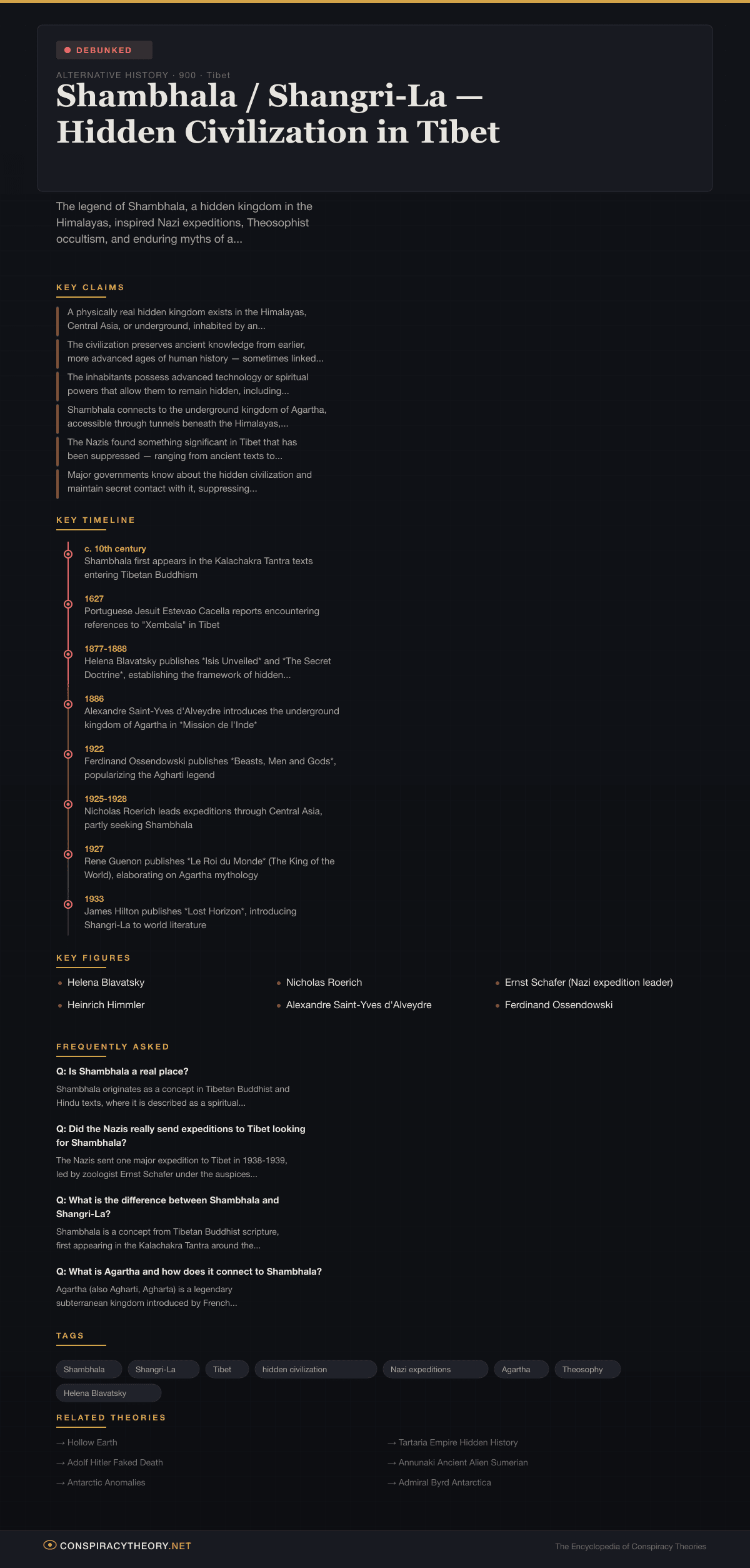 The closely related concept of Shangri-La — Hilton’s 1933 fictional paradise — has become so thoroughly fused with Shambhala in popular imagination that separating the two requires deliberate effort. Add the underground kingdom of Agartha, the Hollow Earth theory, and a genuine Nazi expedition to Tibet, and you have one of the most layered and culturally productive conspiracy narratives of the modern era. It is classified as debunked because the claim of a physical hidden civilization has no supporting evidence and is contradicted by comprehensive modern mapping, satellite imagery, and extensive exploration of the regions where Shambhala has been alleged to exist.