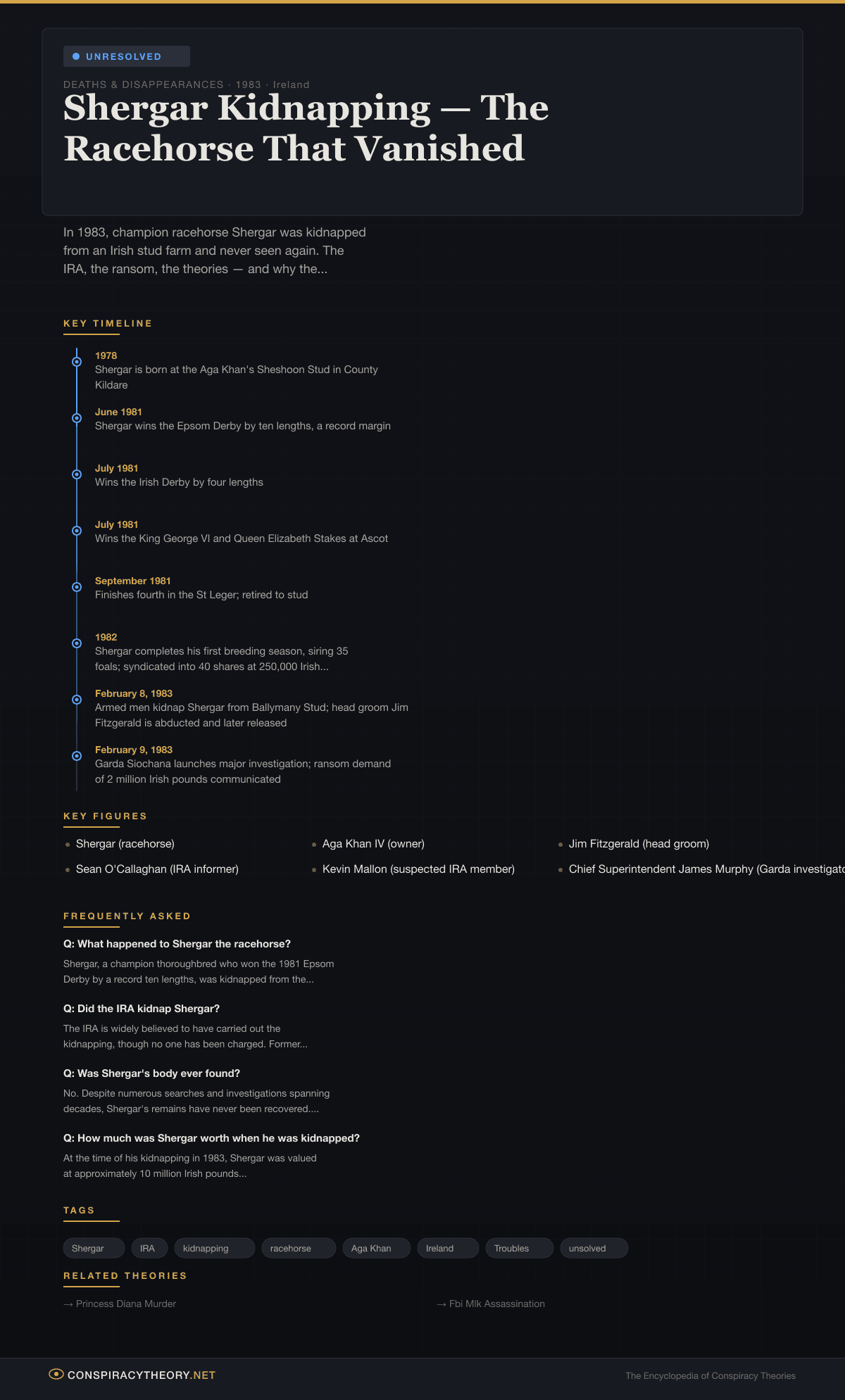 The Shergar case is one of the great unsolved mysteries of 20th-century crime — not because the perpetrators are genuinely unknown (virtually everyone involved in the investigation believes it was the Provisional Irish Republican Army), but because the horse was never recovered, no one was ever charged, and the precise details of what happened after the kidnapping remain contested more than four decades later. It is a story about the intersection of spectacular sporting fame, the grim economics of political violence, a ransom demand that couldn’t be met because of the horse’s unusual ownership structure, and a cover-up maintained by paramilitary omerta.