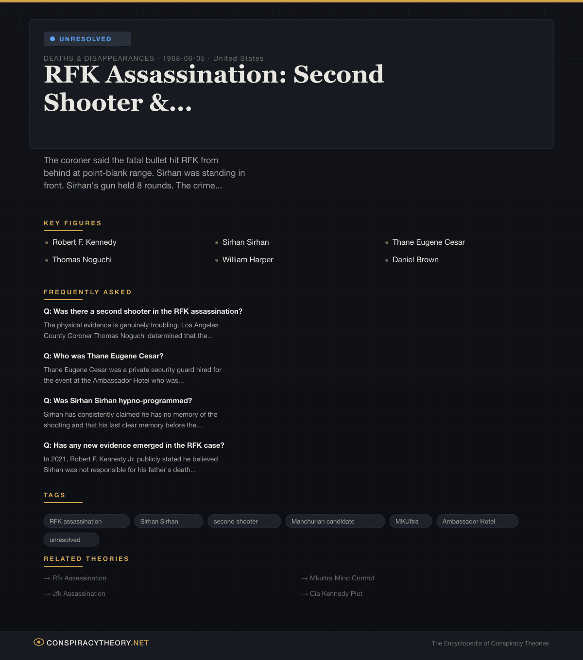 The RFK assassination conspiracy theory isn’t built on speculation or paranoia. It’s built on a coroner’s report that contradicts the physical positioning of the accused shooter, a bullet count that exceeds the capacity of the accused’s weapon, and a suspect whose amnesia has been examined by psychologists who believe it may be genuine. Something happened in that kitchen pantry that the official investigation doesn’t explain.