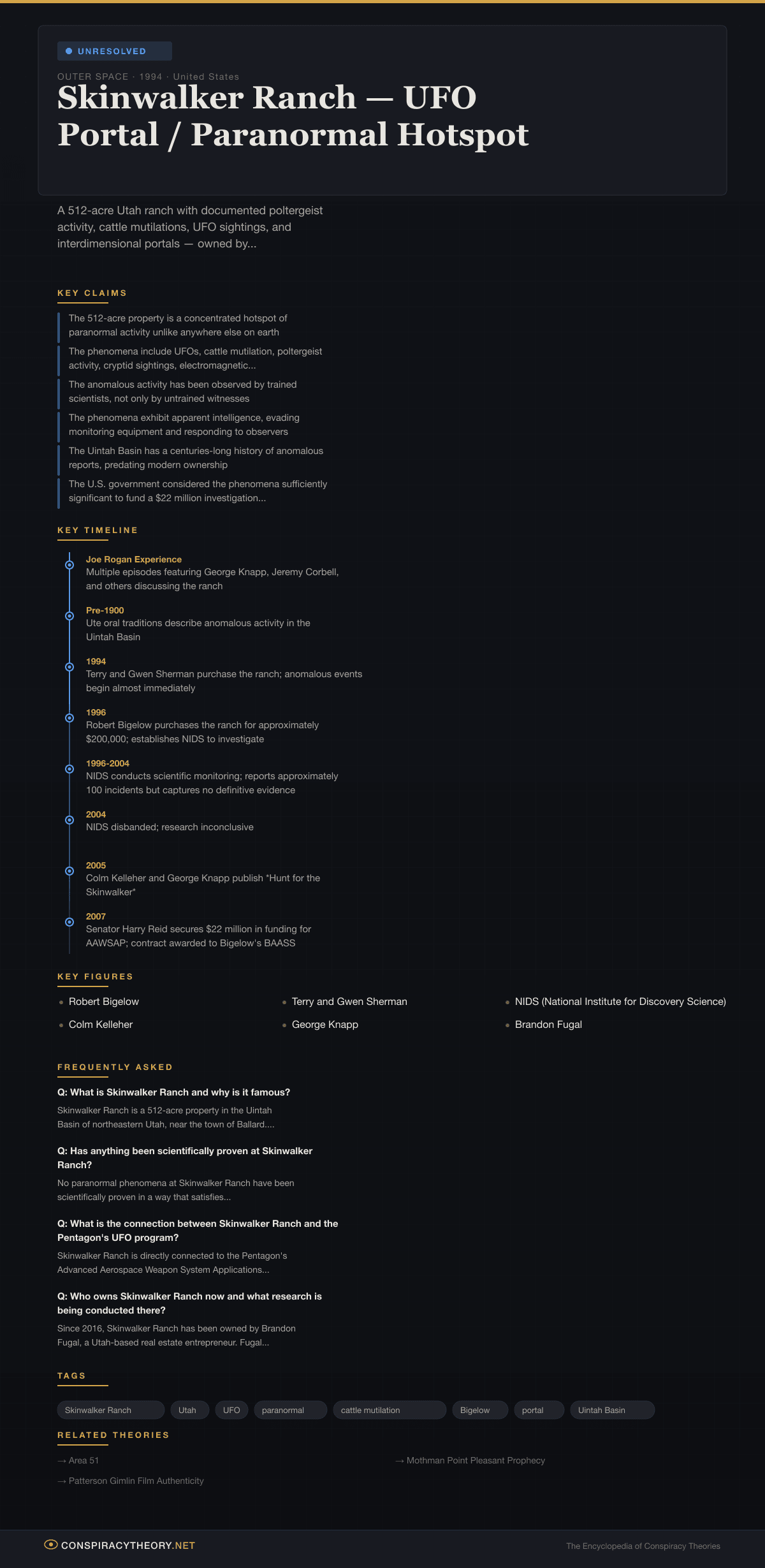 Skinwalker Ranch is a 512-acre property located in the Uintah Basin of northeastern Utah, approximately 150 miles east of Salt Lake City. The ranch has become one of the most famous alleged paranormal hotspots in the world, associated with an exceptionally diverse range of anomalous phenomena including UFO sightings, cattle mutilations, poltergeist activity, sightings of large unidentifiable creatures, luminous orbs, electromagnetic anomalies, and what some observers have described as interdimensional portals.