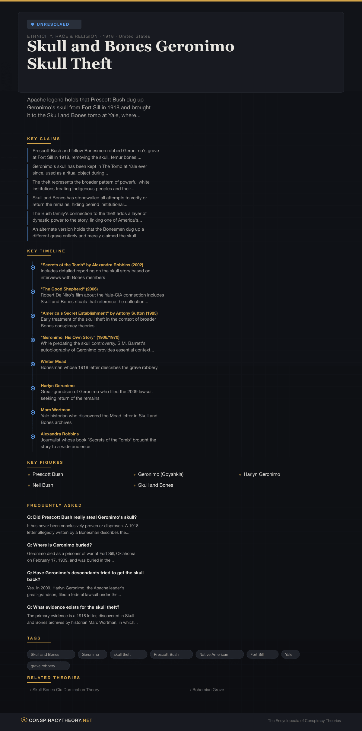 - Prescott Bush and fellow Bonesmen robbed Geronimo’s grave at Fort Sill in 1918, removing the skull, femur bones, and personal effects