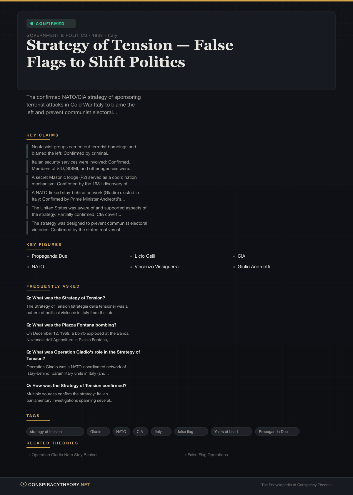 - Operation Gladio — The NATO stay-behind network that provided infrastructure for the Strategy of Tension