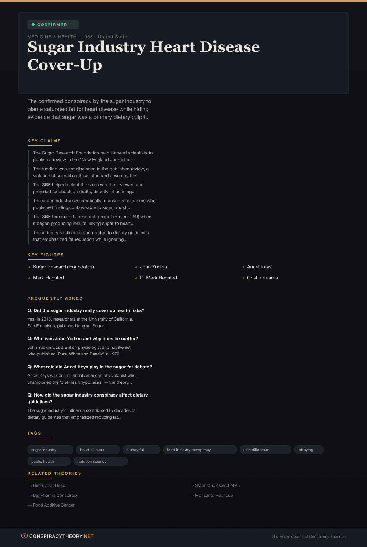 The story of how this happened — and of who made it happen — is one of the most consequential confirmed conspiracies in the history of public health. In 2016, researchers at the University of California, San Francisco, led by dental researcher Cristin Kearns, published a landmark paper in JAMA Internal Medicine revealing that the Sugar Research Foundation, the trade association of the American sugar industry, had secretly funded a 1967 literature review by Harvard scientists that was designed to exonerate sugar and blame saturated fat for heart disease. The review, published in the New England Journal of Medicine — one of the most prestigious medical journals in the world — did not disclose the sugar industry’s funding or its role in selecting the studies to be reviewed.