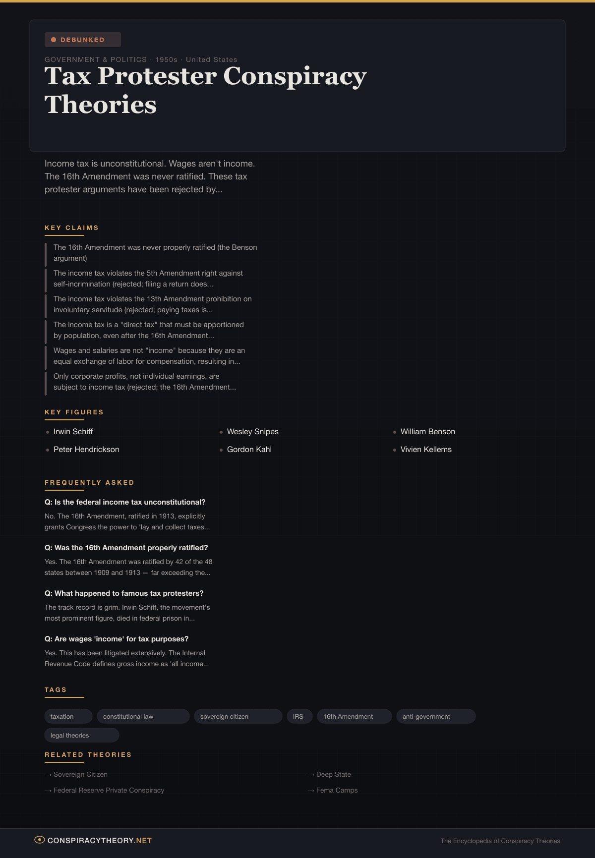 And yet people keep trying. Some lose their homes. Some go to prison. A few have died. The tax protester movement is one of the most thoroughly debunked conspiracy theories in American life, and also one of the most durable, because it promises something that no amount of legal reality can extinguish: the dream of not paying taxes.