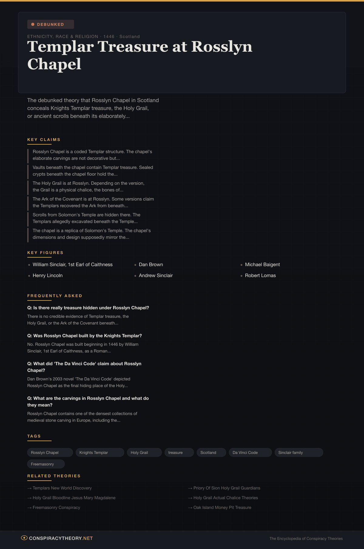 The Rosslyn Chapel treasure theory is one of the most commercially successful conspiracy narratives ever constructed. Popularized by a sequence of pseudo-historical books in the 1980s and 1990s, then detonated into the global mainstream by Dan Brown’s The Da Vinci Code in 2003, it transformed a crumbling rural chapel into one of Scotland’s most visited tourist attractions and lodged the idea of Templar treasure at Rosslyn permanently in popular culture. The theory has been debunked by historians, archaeologists, and even the chapel’s own custodians — but its romantic appeal has proved far more durable than its evidence.