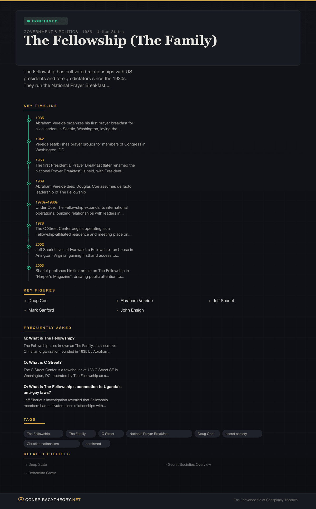 The Fellowship’s status is classified as confirmed. This is not a theory built on speculation or inference. The organization exists. Its leaders have been identified. Its activities have been documented by journalists, most notably Jeff Sharlet, whose 2008 book The Family: The Secret Fundamentalism at the Heart of American Power drew on years of research and firsthand access. Congressional records, tax filings, leaked internal documents, and the testimony of former insiders corroborate the essential claims: that The Fellowship operates a private influence network connecting American politicians to foreign leaders under a theological framework that holds the powerful to be God’s chosen instruments, regardless of their moral conduct.