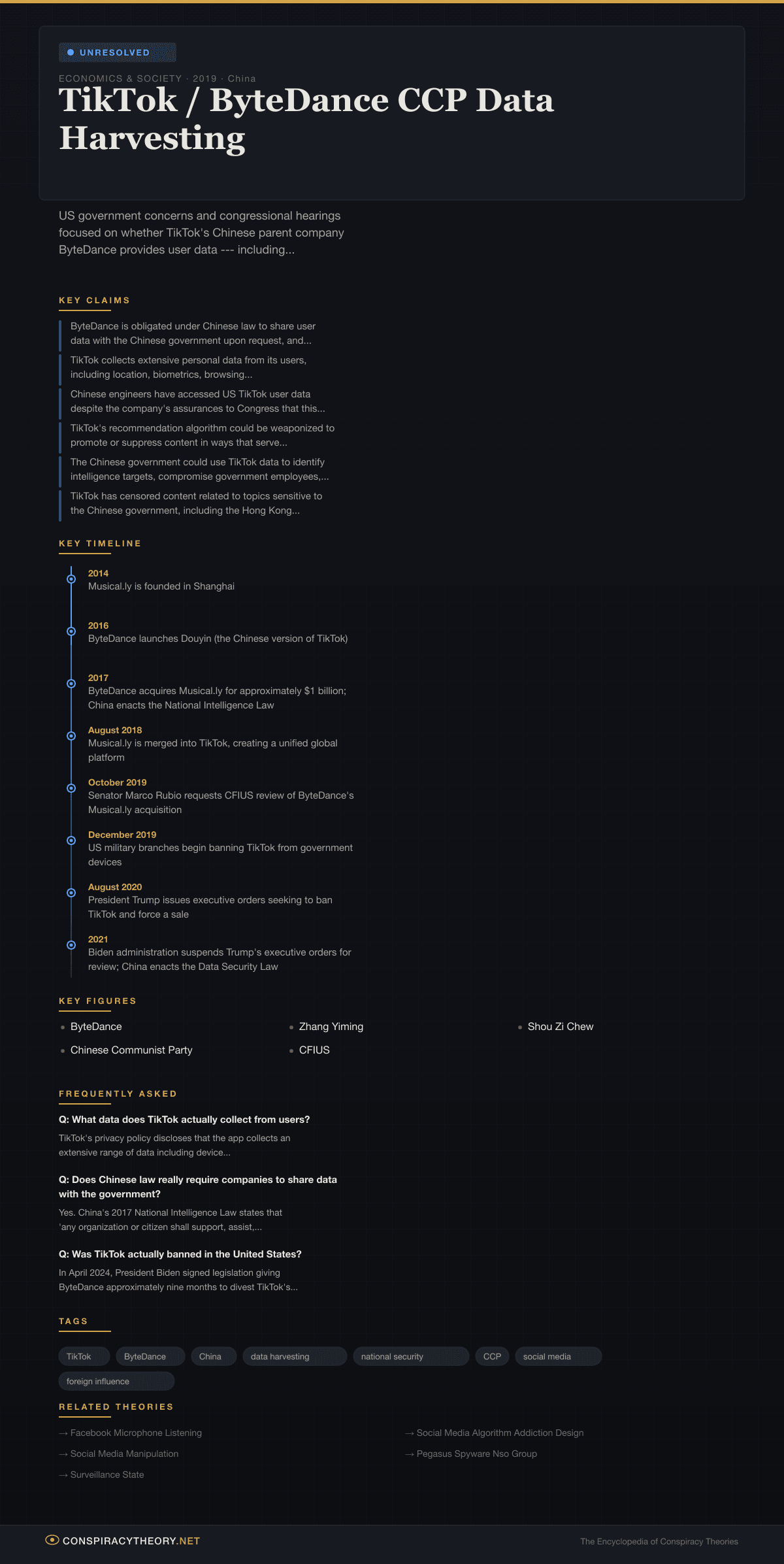 The theory occupies the “unresolved” status because, while the structural conditions for Chinese government access to TikTok data are well-documented (including Chinese laws mandating cooperation with intelligence services), no public evidence has been produced demonstrating that the Chinese government has actually accessed American TikTok user data for intelligence or surveillance purposes. The distinction between capability and demonstrated action remains the central ambiguity of the case.